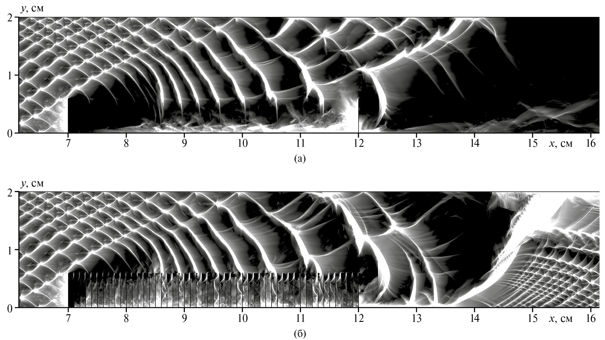 Так, использование воздушного слоя протяженностью Lb = 5 см и высотой Hb = 6 мм позволяет погасить детонационное горение (рис. 4а), в то время как область с препятствиями с теми же параметрами не разрушает детонацию (рис. 4б).