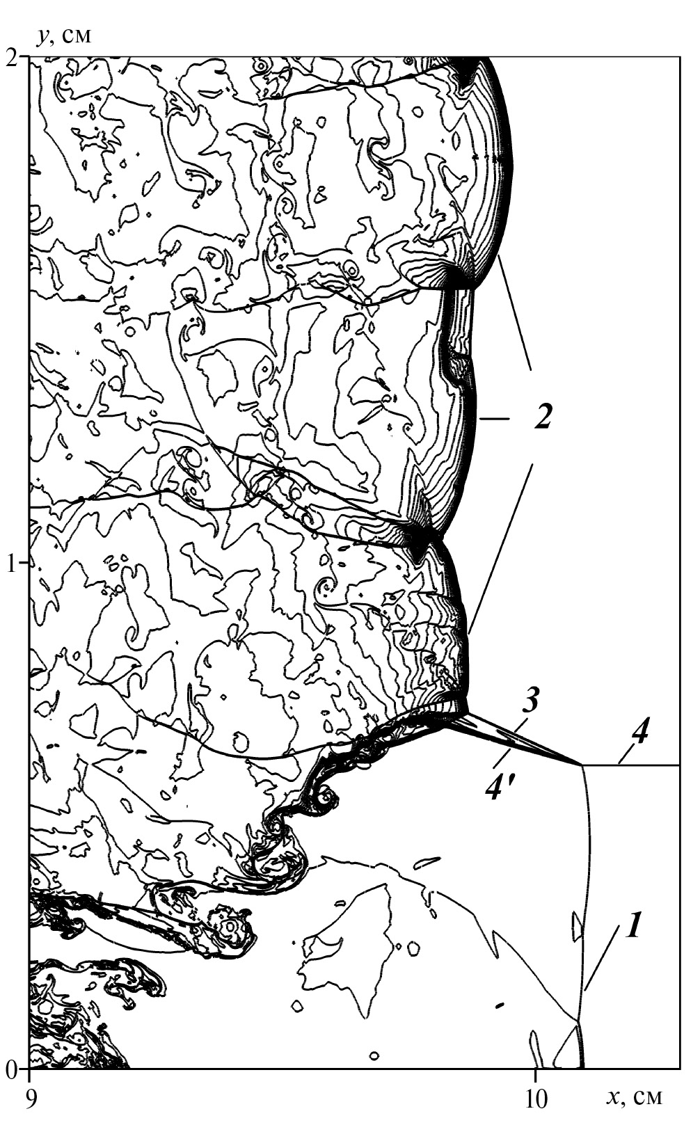Рис. 6. Изолинии плотности в случае взаимодействия детонационной волны со слоем гелия (Lb = 5 см, Hb = 6 мм) в момент t = 0.050 мс: 1 – ударная волна, распространяющаяся по гелию; 2 – детонационная волна; 3 – косой скачок; 4 и 4 ′ – контактный разрыв.
