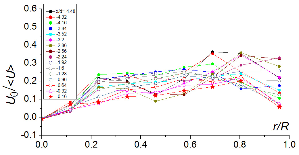 Рис. 12. Распределение окружной компоненты скорости потока по радиусу канала в ответвлении Q1.