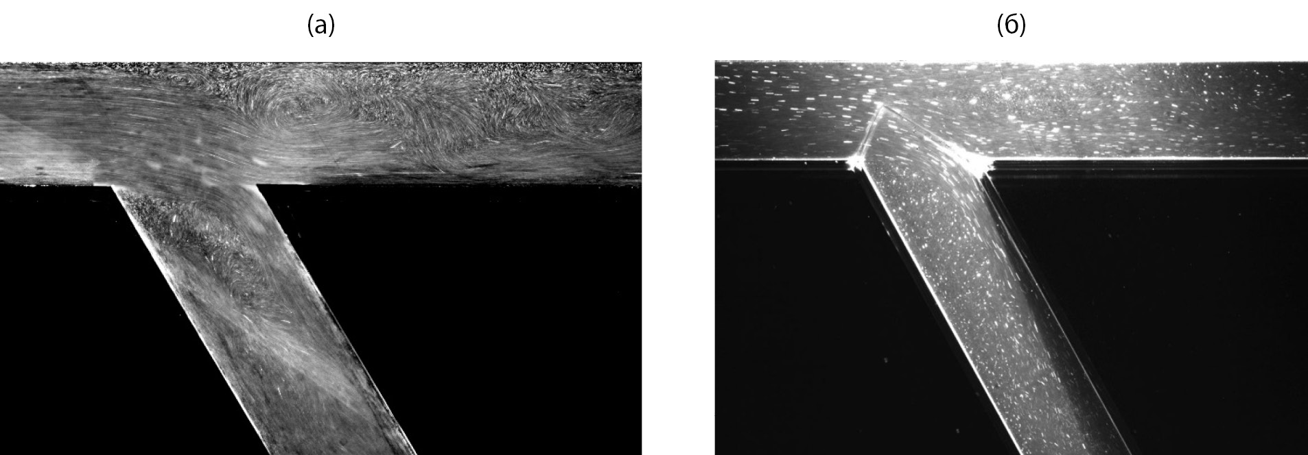 Разветвляющиеся каналы часто встречаются в различных технических устройствах: системах транспортировки горючего и охлаждающей жидкости, элементах химических технологий и т.д. Часто область разветвления представляет собой гладкий прямой канал с ответвлением, установленным к нему под некоторым углом. При этом в каналах ниже разветвления, как правило, формируются отрывные течения, интенсивность которых зависит как от угла между ответвлением и подводящим каналом, так и от доли расхода, протекающего через каждое ответвление. Отрыв потока приводит к повышению гидродинамического сопротивления таких каналов и другим неблагоприятным последствиям.