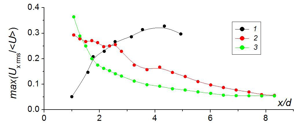 Рис. 10. Изменение максимальных значений интенсивности пульсаций продольной компоненты скорости потока в ответвлении Q1: 1 – при отсутствии закрутки; 2 – на верхней и 3 – нижней границе области торможения закрученного потока.
