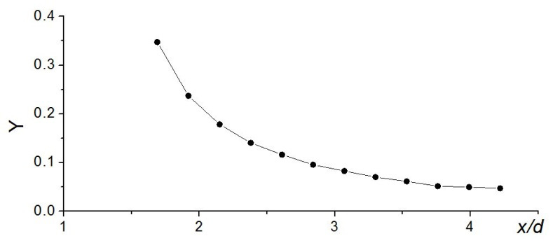 По результатам SIV-измерений проанализирована эволюция структуры течения на участке гладкого канала (подводящем участке артерии) между завихрителем и областью разветвления (анастомозом). Здесь при представлении результатов, в отличие от рис. 1, начало координат располагалось в выходном сечении завихрителя. Установлено, что степень закрутки потока вблизи завихрителя составляет Y = 0.16, а зависимость Y (x / d) имеет немонотонный характер, который можно объяснить отсутствием осевой симметрии поля течения вблизи завихрителя из-за влияния следа за его лопатками, характерным для лопаточных завихрителей [30]. При x / d > 2.5 степень закрутки плавно снижается с замедлением темпа снижения при приближении к области разветвления, и достигает величины Y ≈ 0.125 непосредственно перед разветвлением (рис. 3), что находится в пределах естественных физиологических значений.