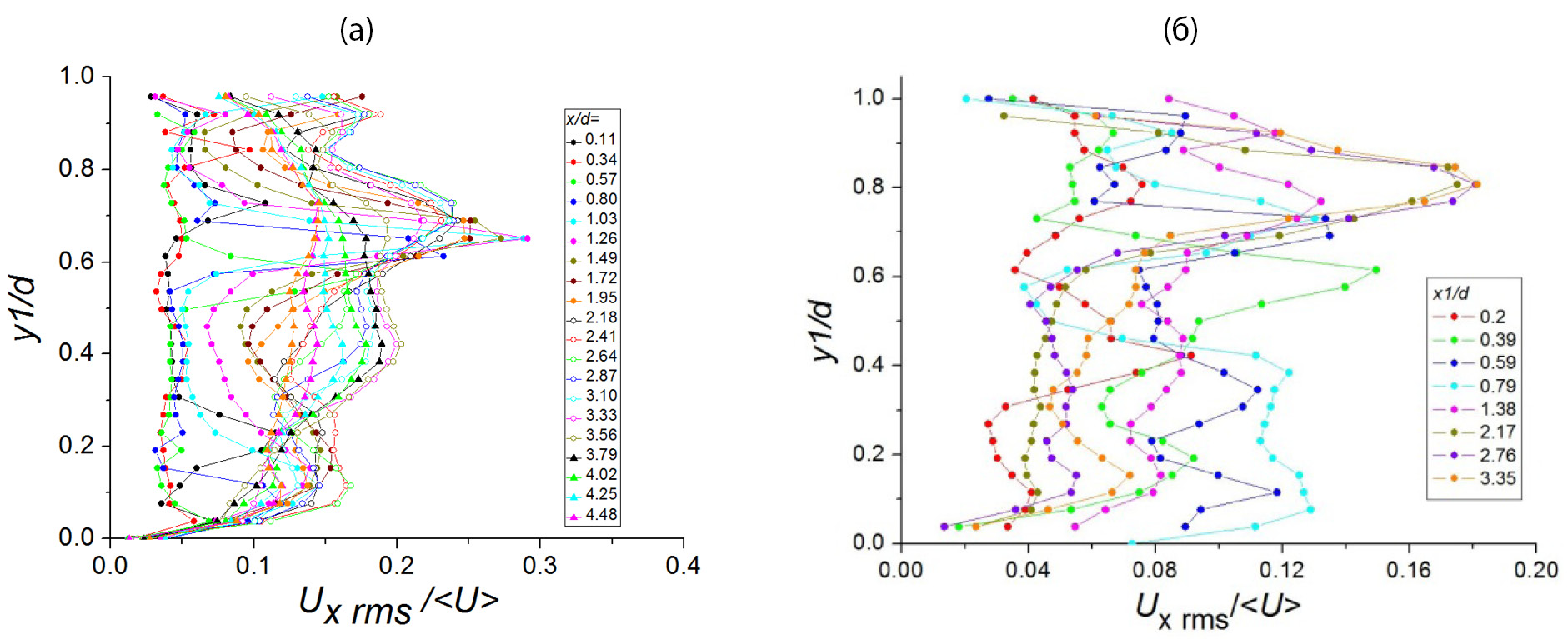 Значительно меньшее влияние закрутки на структуру потока в ответвлении Q2 (шунте), обнаруженное по результатам визуализации течения (рис. 6), также подтверждается данными SIV измерений. Так, область возвратного течения вдоль образующей, прилегающей к тупому углу разветвления, сохраняется, однако под влиянием закрутки ее продольный размер в этом ответвлении возрастает почти в 1.5 раза: с 0.8 d без закрутки (рис. 13а) до примерно 2 d при ее наличии (рис. 13б). Однако поперечный размер этой области (по координате y) практически не изменяется. Максимальная скорость в зоне высокоскоростной струи, образующейся над областью отрыва потока в этом ответвлении (шунте) также остается неизменной. Однако в закрученном потоке размер этой области по координате y становится несколько больше, в результате чего увеличивается поперечный градиент скорости на ее границе (рис. 13а), что приводит к ожидаемому росту интенсивности пульсаций продольной компоненты скорости в этой области. Это хорошо видно как на профилях пульсаций (рис. 14), так и при сравнении изменения максимальных значений интенсивности пульсаций max (Ux rms/<U>) по длине ответвления Q2 (рис. 15).