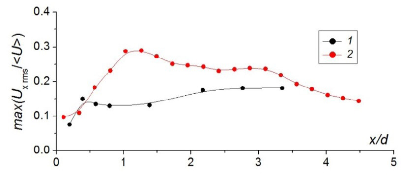 Рис. 15. Изменение максимальных значений интенсивности пульсаций продольной компоненты скорости потока в ответвлении Q2: 1 – при отсутствии закрутки; 2 – в условиях закрутки потока.