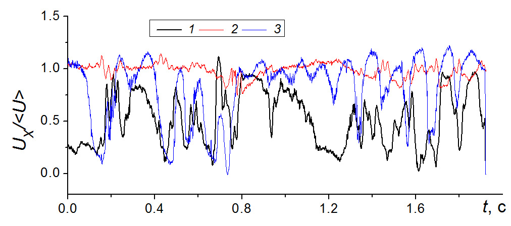Рис. 16. Осциллограммы продольной компоненты скорости в области торможения потока (дефекта скорости) ответвления Q1 при x / d = 1.3: 1 – y / d = 0.46 (нижняя граница зоны торможения); 2 – высокоскоростной поток ниже зоны торможения; 3 – y / d = 0.76 (верхняя граница зоны торможения).
