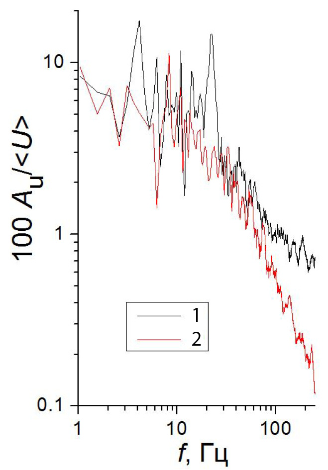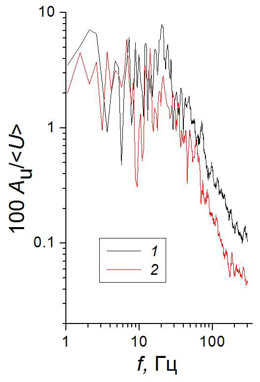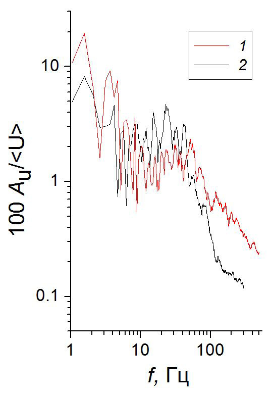 Рис. 24. Спектры пульсаций скорости потока в ответвлении Q2 в присутствии закрутки потока: 1 – x / d = 1.03; y / d = 0.65 (в слое смешения в области наибольших пульсаций скорости); 2 – x / d = 3.1; y / d = 0.69 (в слое смешения вниз по потоку).