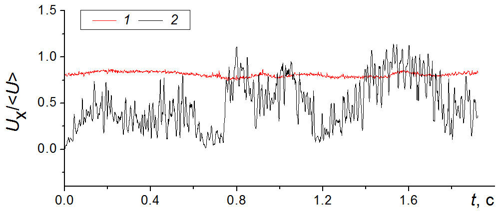 Рис. 21. Осциллограммы скорости потока в ответвлении Q2 при отсутствии закрутки: 1 – x / d = 1.0; y / d = 0.9 (в зоне высокоскоростной струи над областью отрыва потока); 2 – x / d = 2.5; y / d = 0.85 (в слое смешения на границе отрывной области).