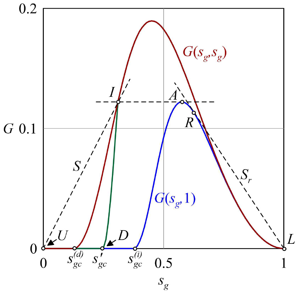 Таким образом, исследование фильтрации сводится к решению одного уравнения гиперболического типа (16), в котором функция потока G (17) зависит не только от значения sg в данный момент времени t, но и от исторически максимального значения насыщенности sg,hy (18). При sg = sg,hy имеем кривую G (sg, sg) для процесса дренажа, а при sg,hy = 1 кривая G (sg, 1) описывает процесс пропитки (рис. 3).