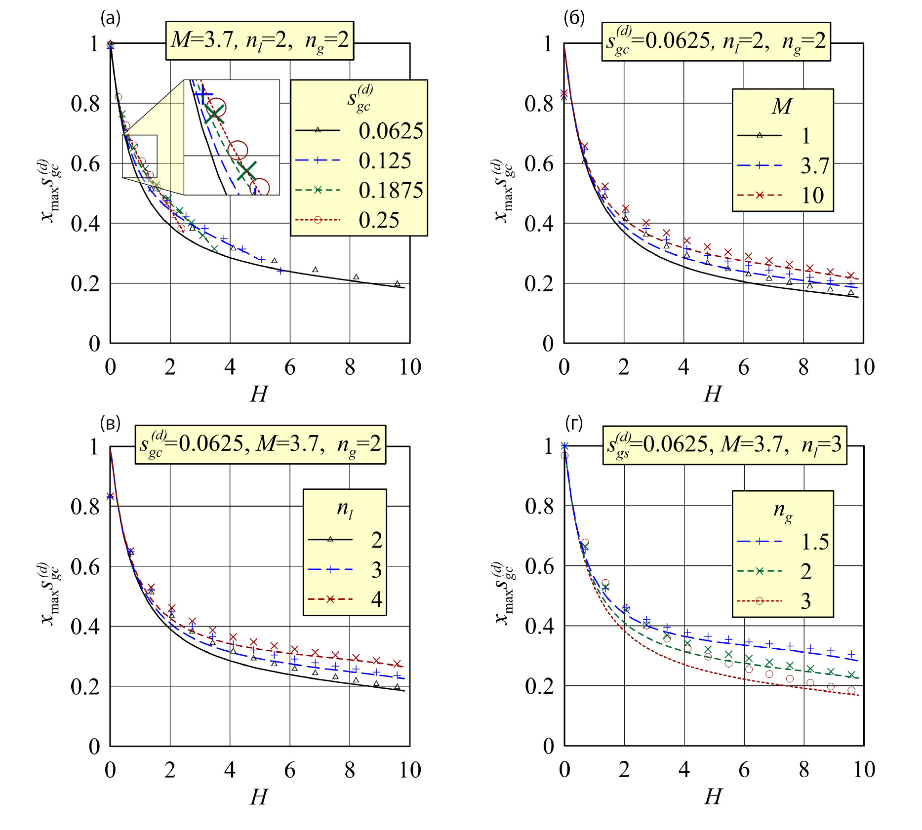 Результаты расчетов демонстрируют, что при увеличении H перемещение xmax снижается. Действительно, большим H соответствуют большие критические насыщенности и, следовательно, большие объемы фазы g, обездвиживаемой при . Таким образом, меньший объем g остается в подвижном состоянии, что в свою очередь снижает xmax. Этот результат сохраняется в широком диапазоне M, nl и ng (рис. 5, б–г).