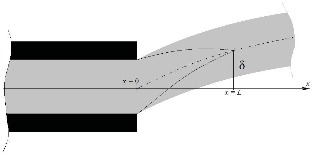 Механизм формирования изгибного течения связан с протеканием процессов установления профиля скорости в жидкости за срезом канала. Если характерная длина установления профиля скорости в струе равна L, а смещение оси струи относительно оси форсунки в этой точке составляет δ (рис. 1), величина вязких сил, действующих вдоль оси струи Fv ~ µu0r02 / L. Момент этой силы, искривляющей струю и усиливающий малое начальное возмущение, Mv ~ δ · Fv. При наличии изгиба поле скорости жидкости в струе деформируется с возникновением нескомпенсированного напряжения, инициирующего противодействующий изгибу момент. Считая малой кривизну струи k, можно получить величины разности «пробега» жидких частиц на краях струи из-за изгиба ~ 2r0kL, противодействующего ему напряжения τop ~ r0µ(dk / dt) и соответствующего момента Mop ~ r03τop. Когда кривизна мала можно использовать приближенное соотношение k ~ δ / L2 и получить выражение для скорости изменения δ на начальной стадии изгиба струи, характеризующее линейное возрастание малого начального изгибного возмущения: