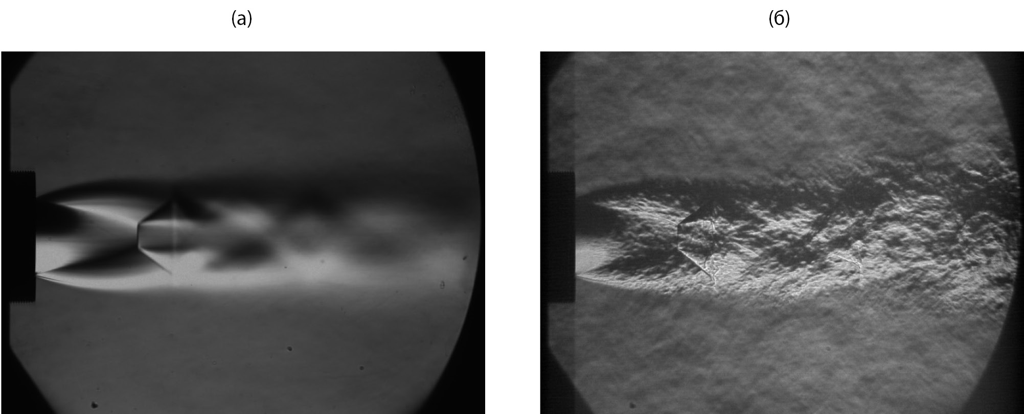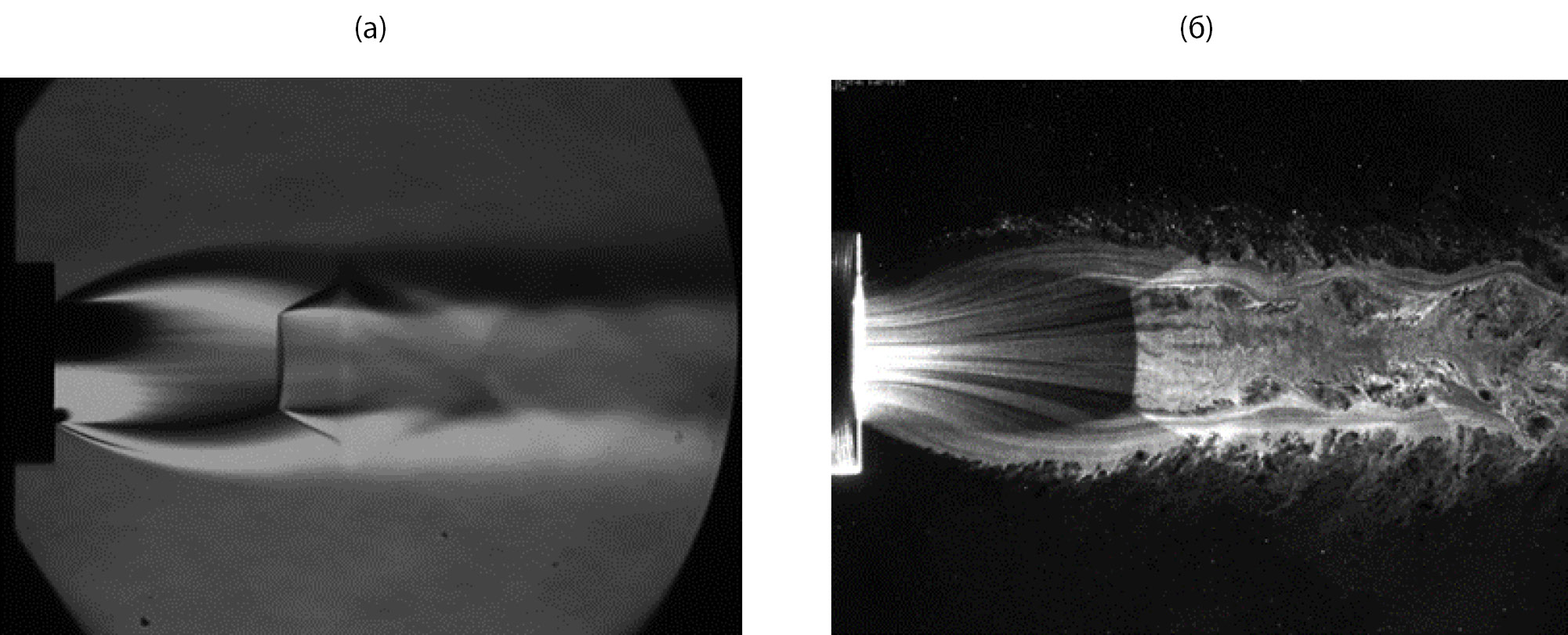 На рис. 1а приведена шлирен-фотография, полученная при Npr = 5 и D = 30 мм с большим временем экспозиции — 10 мс. Отчетливо наблюдаются граница струи, диск Маха, висячий и отраженные скачки уплотнения, слой смешения, формирующийся за тройной точкой, что соответствует общепринятому объяснению структуры течения на начальном участке сверхзвуковой недорасширенной струи [1–3]. На рис. 1б представлена шлирен-фотография, полученная при малой (мгновенной) экспозиции, равной 3 мкс. Видно, что уже в первой ячейке струи течение турбулизуется, а во второй ячейке на границе струи формируются крупномасштабные вихревые структуры.