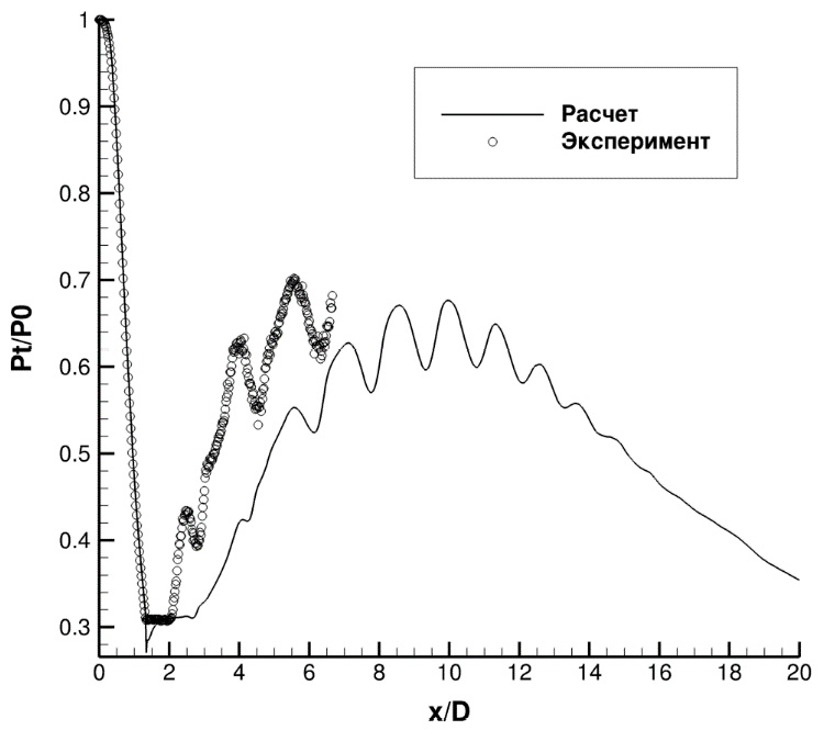 Существенное расхождение расчетных и экспериментальных значений давления Пито вниз по потоку от диска Маха отмечалось ранее в работах [5–7], где численное моделирование было выполнено на основе уравнений, осредненных по Рейнольдсу. При использовании SST-модели турбулентности давление Пито за диском Маха вообще не растет, оставаясь далее приблизительно постоянным. При использовании q-ω-модели оно сильно колеблется в данной области, но также совершенно не совпадает с экспериментальным распределением, при этом некорректно предсказывается даже положение диска Маха. В указанных работах было предположено, что неспособность моделей турбулентности правильно воспроизвести данное течение связана с тем, что они некорректно описывают производство кинетической энергии турбулентности на скачках уплотнения. Было предложено применять дифференциальные модели для напряжений Рейнольдса, не использующие гипотезу Буссинеска о связи напряжений Рейнольдса с градиентами средних величин. После специальной модификации одной из таких моделей удалось добиться существенно лучшего согласия (хотя и не полного совпадения) с экспериментальными данными.