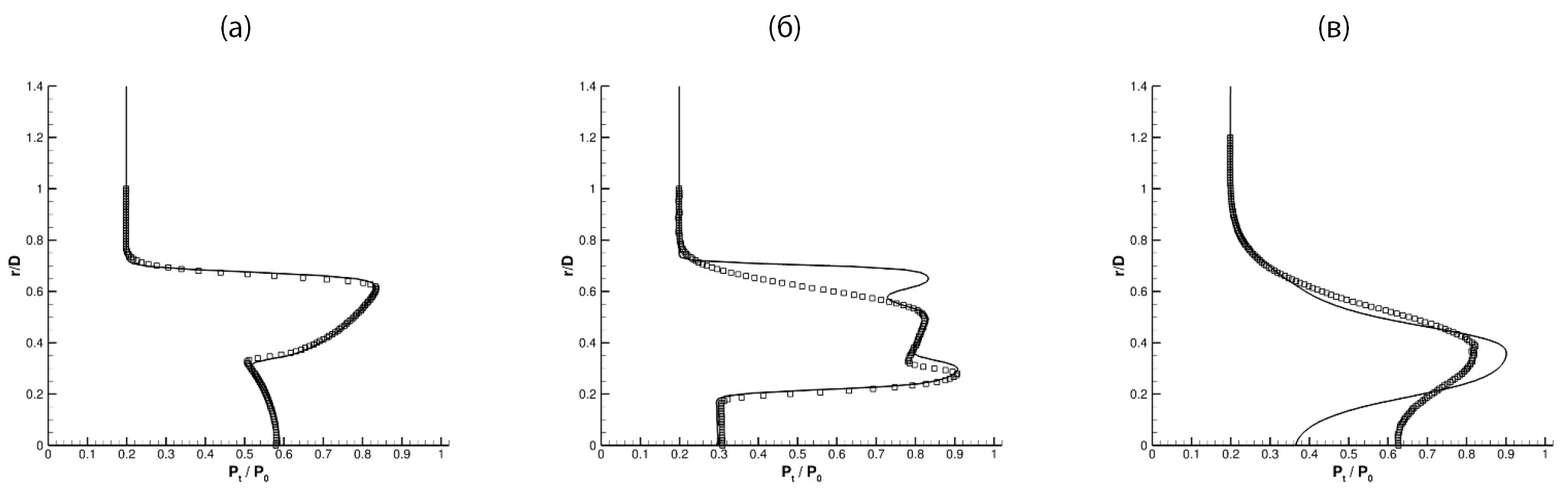 Рис. 6. Профили давления Пито в эксперименте (квадратные символы) и в расчете (сплошные кривые) при Npr = 5 в сечениях x / D = 0.833 (a), 1,5 (б) и 3.5 (в).