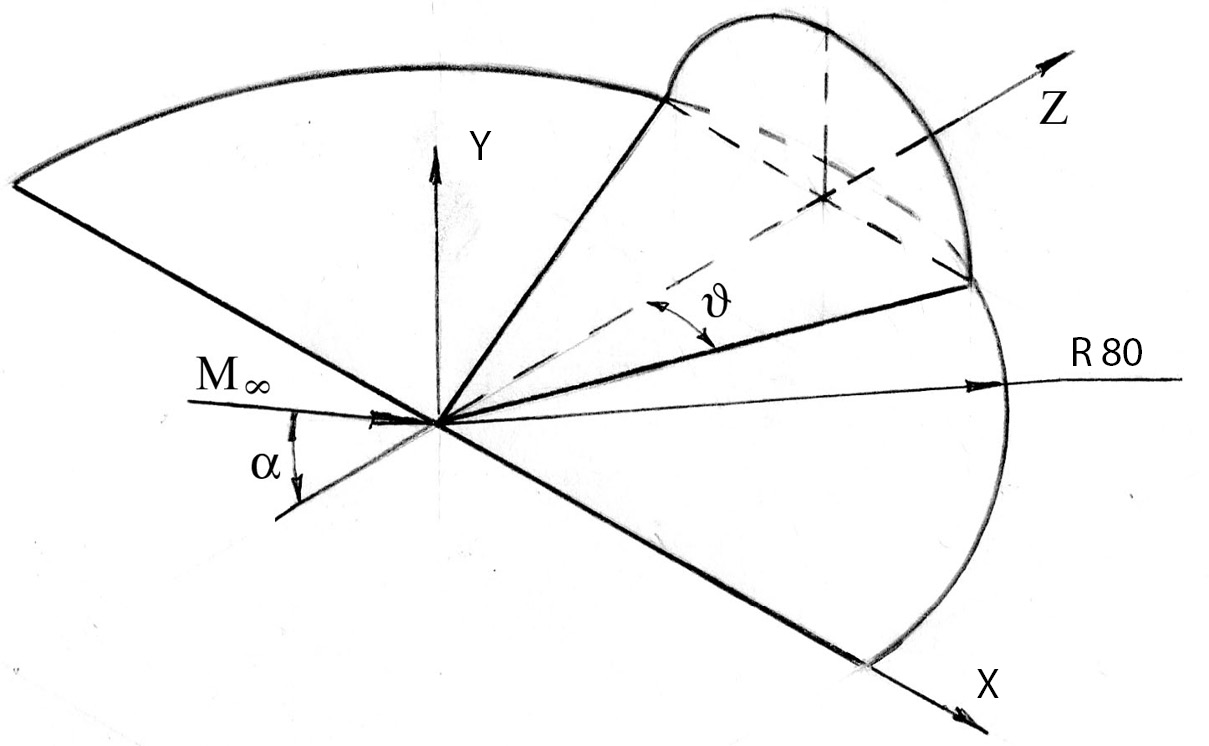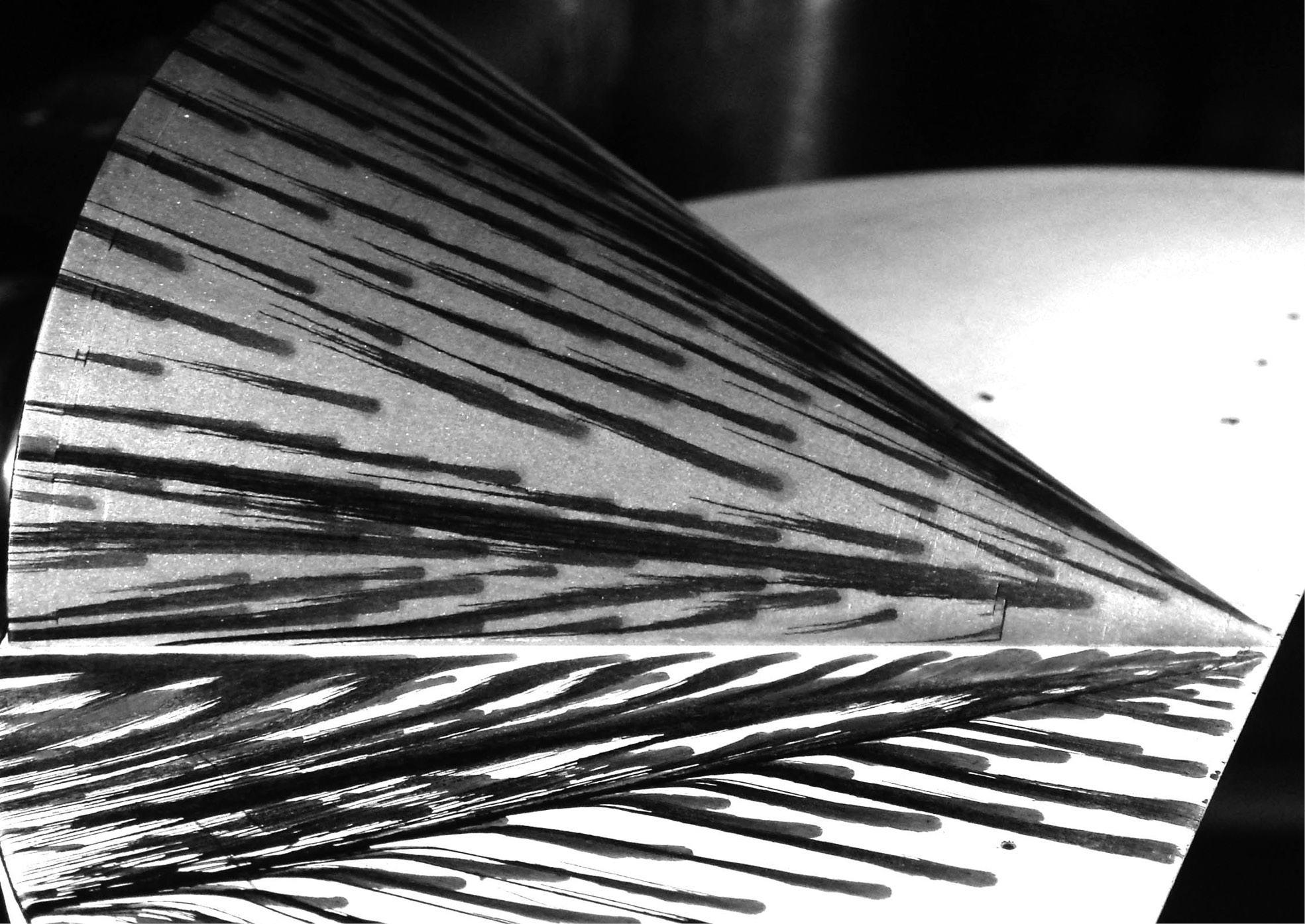 Экспериментальная модель (рис. 1) представляет собой пластину с острой передней кромкой и устанавливаемыми на ней сменными полуконусами. Их вершины совпадают с передней кромкой пластины, а полууглы раскрытия ϑ изменялись в диапазоне 15 ÷ 30° с шагом 5°. Длина образующей полуконуса составляла 80 мм, а размах передней кромки — 160 мм. Эксперименты проводились в сверхзвуковой аэродинамической трубе А-3 НИИ механики МГУ [5] при числе Маха М = 3. Единичное число Рейнольдса составляло Re = 1.1 × 108 1/м, что обеспечивает завершение перехода от ламинарного к турбулентному пограничному слою на расстоянии ~ 10 мм от передней кромки пластины. Наряду со стандартными методиками, а именно, визуализацией картин линий тока на поверхности модели (метод масло-сажевых покрытий) и измерением давления по поверхности крыла, применялся специальный оптический метод для визуализации конических течений [6]. Это позволило получать теневые картины течения в плоскости, нормальной образующей полуконуса при его пересечении с пластиной.