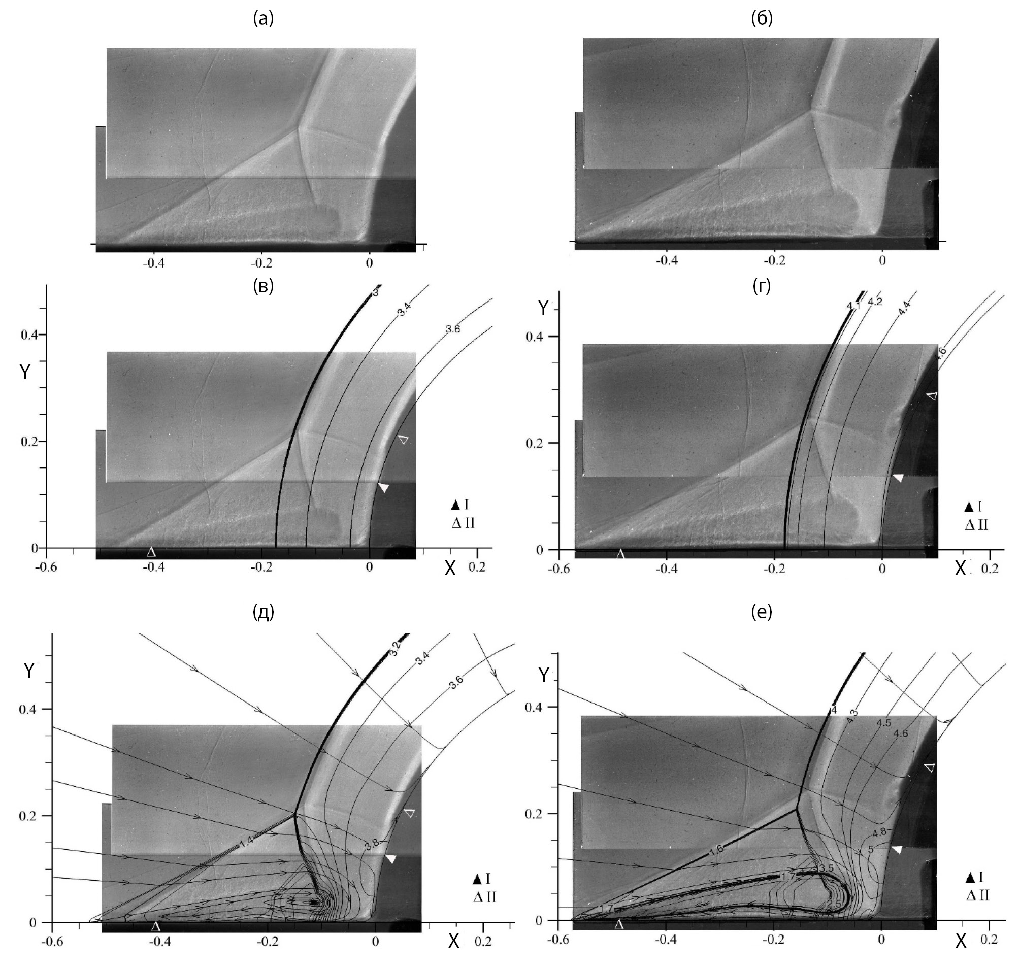 Сравнивая теневые картины обтекания с результатами расчета для вязкого газа (рис. 8в), можно наблюдать образование практически идентичных ударно-волновых систем с двумя точками ветвления. Почти эквидистантный их сдвиг определяется бóльшей толщиной ударного слоя около полуконуса, полученной в расчете. Учитывая конический характер течения, смещение внутреннего скачка уплотнения влечет за собой изменение положения линии отрыва на пластине, т.е. увеличение угла, который она составляет с направлением потока за ударной волной, присоединенной к передней кромке пластины. При этом увеличивается число Маха скорости, нормальной к линии отрыва, что, в свою очередь, является одним из факторов, вызывающим значительное превышение расчетных значений «плато давления» (кривые II) по сравнению с экспериментальными (символы I) на кривых распределения давления по поверхности модели, приведенных на рис. 9.