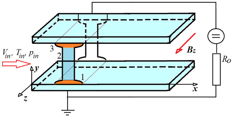 В данной работе рассматривался частный двухмерный случай развития газодинамических и электродинамических процессов в переменных x–y, с вектором индукции внешнего магнитного поля, направленного только вдоль оси z B = ezBz, поэтому в системе электродинамических уравнений удобно использовать эффективные компоненты напряженности электрического поля [9]