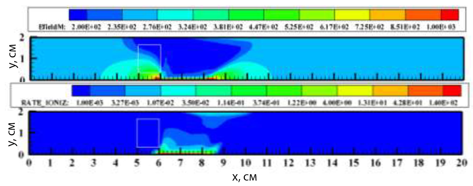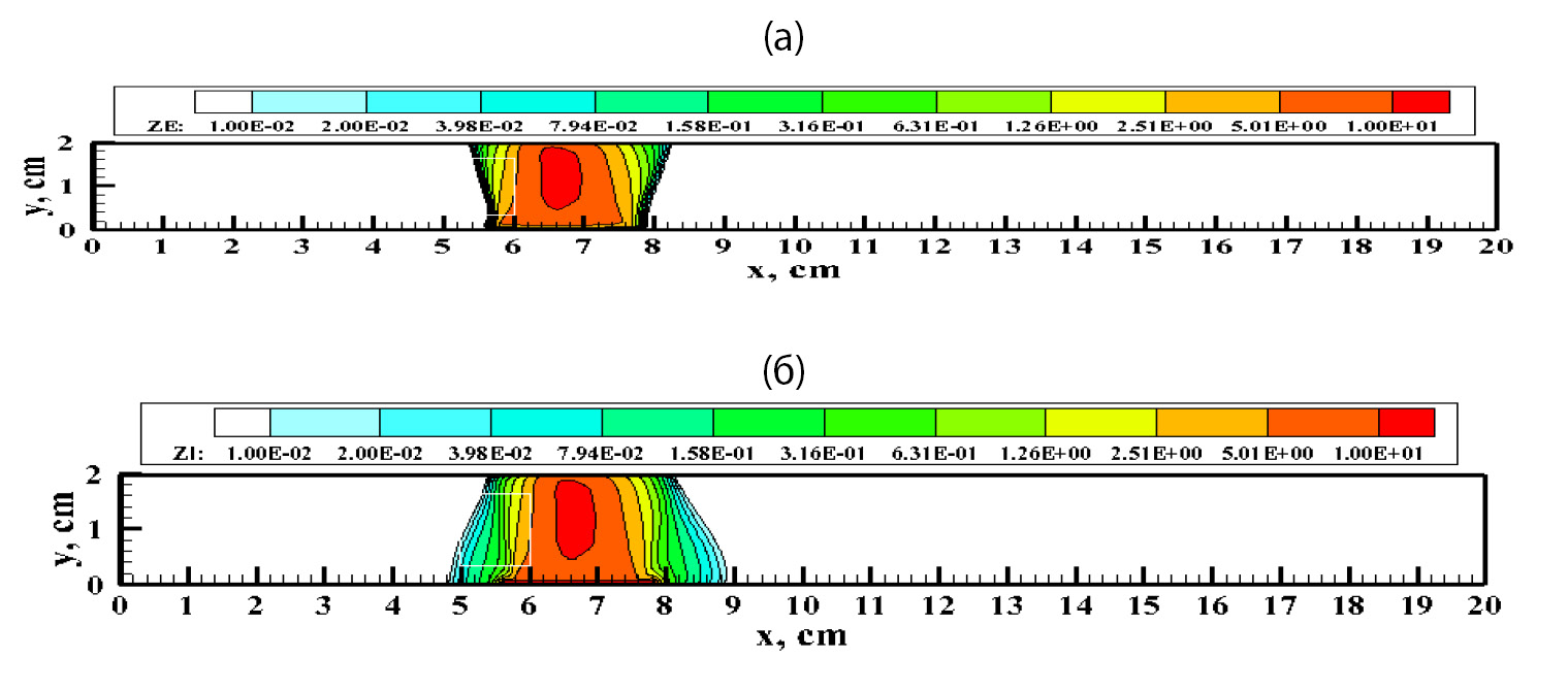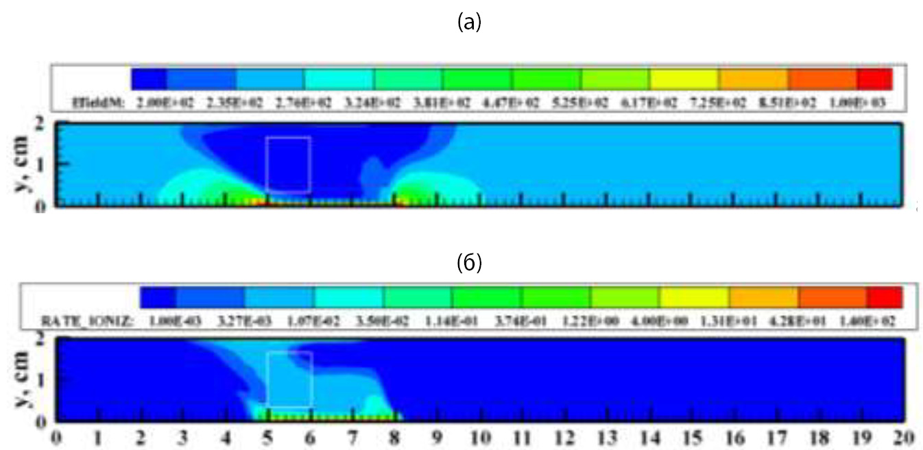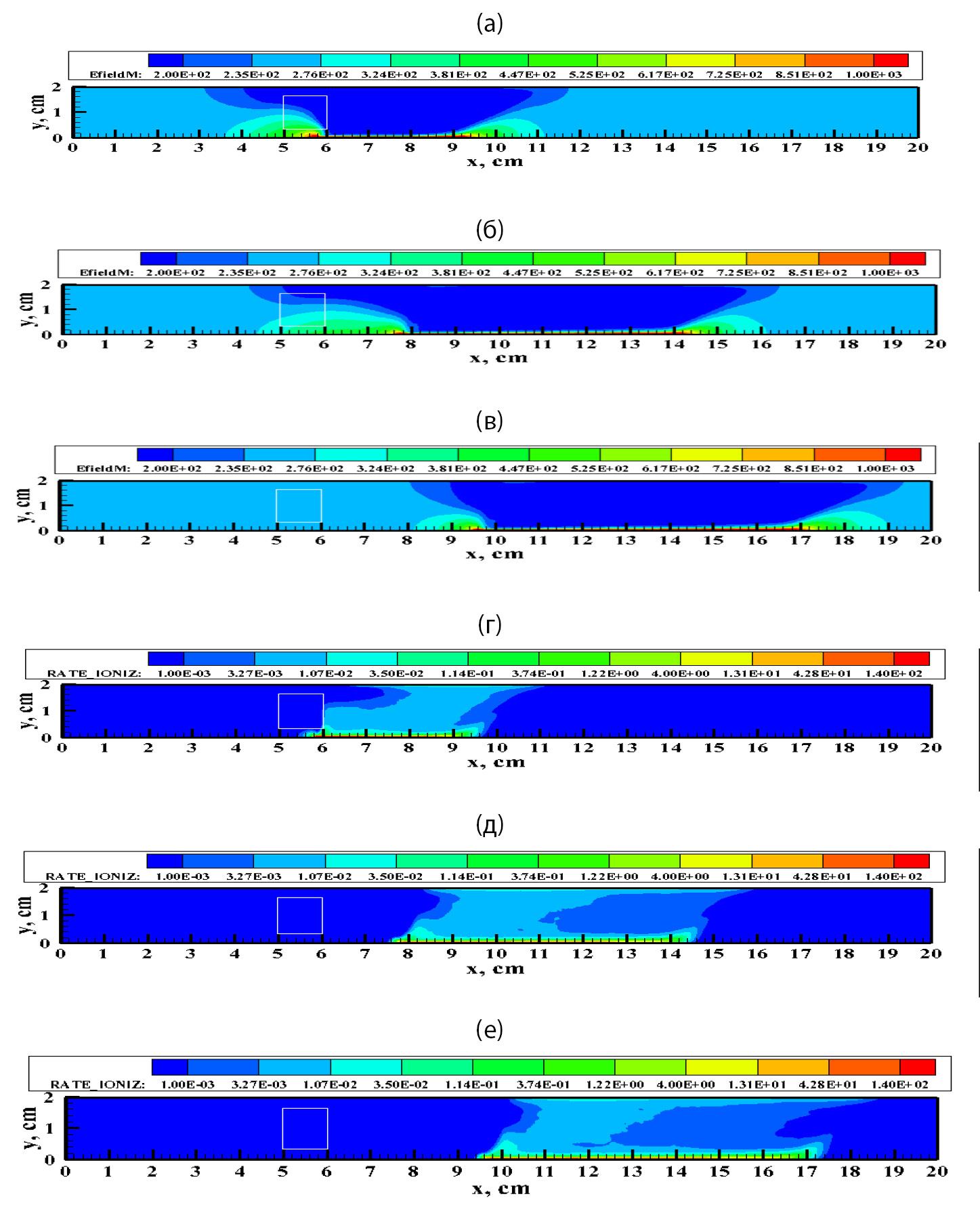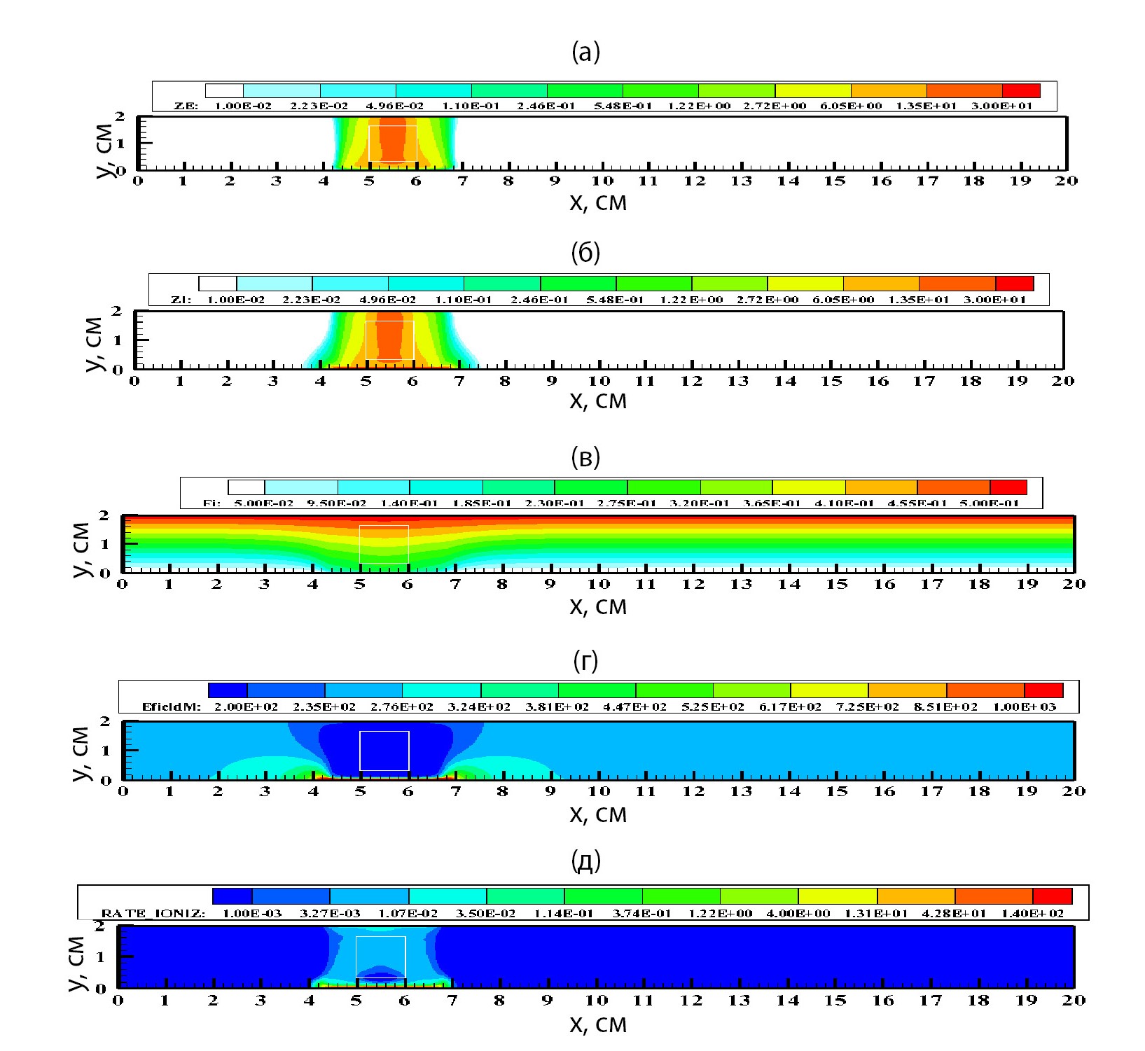 Вблизи верхней поверхности канала локализован анодный слой отрицательного объемного заряда. На самой поверхности концентрация ионов стремится к нулю. Положение токового столба тлеющего разряда хорошо идентифицируется по распределению электрического потенциала на рис. 2в. Хорошо видно, что наибольший градиент электрического потенциала сосредоточен в катодном слое, где формируется область наибольших значений напряженности электрического поля (рис. 2г). Следствием такой локализации напряженности является локализация областей наибольшей скорости ионизационных процессов: в наибольшей степени вблизи катодного слоя и значительно меньше — у анодного слоя (рис.2д).