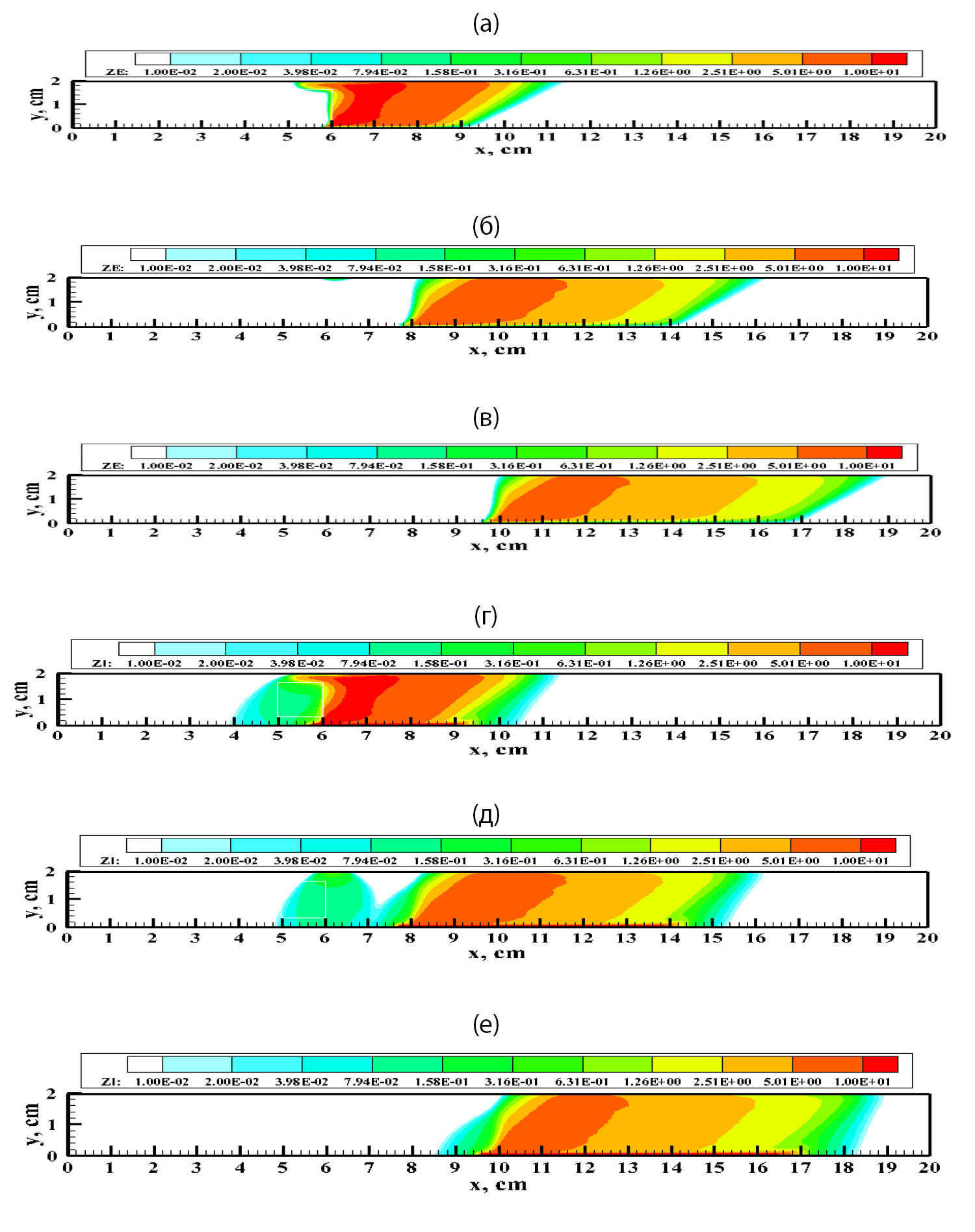 В данном случае оценка скорости смещения дает величину U = 85 см/с, заметно меньшую, чем скорость газа в центре канала, но большую, чем смещение в потоке М = 5 при отсутствие магнитного поля. Обращает на себя внимание постепенное изменение формы токового столба, характерное для учета магнитного поля (сравните с рис. 4). Как и прежде отметим заметно более быстрый уход электронов из периферийных областей токового столба, чем ионов. Естественно, что при скорости потока М = 5 с учетом магнитного поля с отрицательной поляризацией вектора магнитной индукции Bz = –0.01 Тл (рис. 9) наблюдается более быстрое смещение столба разряда. К моменту времени t = 16.9 мс (при М = 5) положительный столб разряда сместился примерно на 6 см (рис. 9в, е), в то время, как к моменту времени t = 24.8 мс (при М = 2) смещение составило примерно 1 см (рис. 8в, е). Скорость смещения в этом случае оценивается U = 380 см/с.