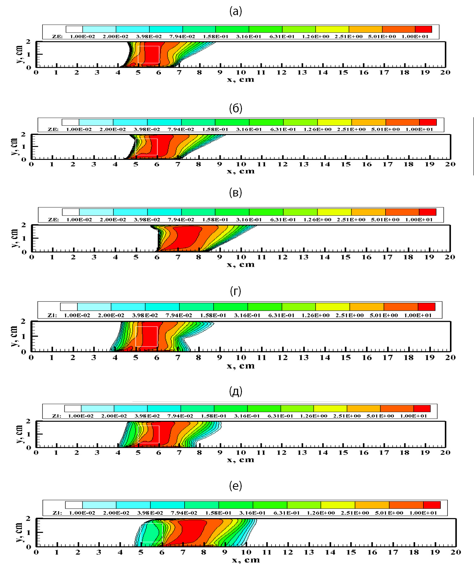 На рис. 8 показаны результаты расчетов нормального тлеющего разряда в потоке молекулярного азота при М = 2 и Bz = –0.01 Тл. Сравнивая распределения электронных и ионных концентраций в близкие моменты времени без учета магнитного поля и с учетом при t = 26 мс (рис. 6а, б) и t = 24,8 мс (рис. 8в и 8е) соответственно, отчетливо видим, что магнитное поле с отрицательной поляризацией вектора магнитной индукции весьма заметно ускоряет смещение токового столба в положительном направлении оси х.