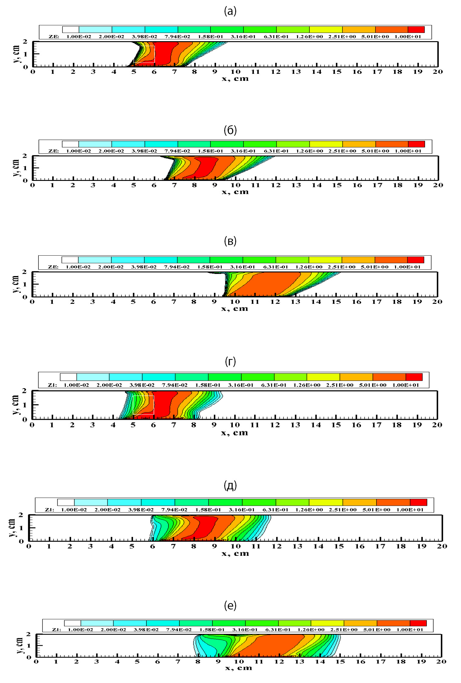 Заметим, что направление перемещения токового столба легко оценить с использованием электродинамического правила “левой руки” [10]. Вблизи нижней поверхности направление тока от анода к катоду (по определению — это ток ионов). Поэтому в магнитном поле с отрицательным направлением вектора индукции магнитного поля (против оси z) генерируемая в столбе магнитная сила направлена в положительном направлении оси x. С целью проверки симметрии конечно-разностных операторов в разработанном компьютерном коде аналогичные расчеты при Bz = +0.01 Tл подтвердили идентичность результатов при движении плазменного столба в отрицательном направлении оси x. Относительно характера перемещения тлеющего разряда отметим следующее. После включения магнитного поля наблюдается начальная фаза взаимодействия с ним токового столба газоразрядной плазмы. В тлеющем разряде наблюдаются колебания ионных и электронных концентраций. Этот эффект был отмечен в [8]. На рисунках 4а и 4г частично отражена эта фаза процесса. После завершения колебательного процесса токовый столб начинает двигаться примерно с постоянной скоростью в положительном направлении оси х. Примечательно, что на рисунке 4д видна фаза запаздывания дрейфа ионов к катоду (область повышенной концентрации ионов при 5 см ≤ x ≤ 7 см). Электроны, обладающие большей подвижностью, уже покинули эту область. По причине меньшей подвижности и коэффициентов диффузии ионов, при движении разряда вдоль поверхности область катодного слоя запаздывает по сравнению с анодным слоем. Распределения модуля напряженности электрического поля и скорости ионизационных процессов в последовательные моменты времени (рис. 5) показывает их локализацию вблизи катодной и анодной поверхностей.