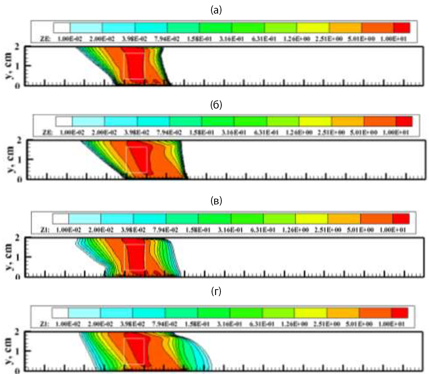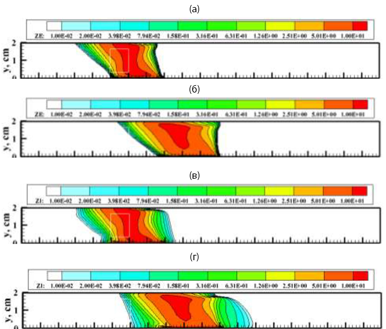 Рис. 11. Распределение концентраций электронов (а, б) и ионов (в, г) в последовательные моменты времени t = 2.8 мс (а, в) и 16.2 мс (б, г) после начала движения разряда в потоке М = 5 с магнитным полем Bz = +0.01 Тл.