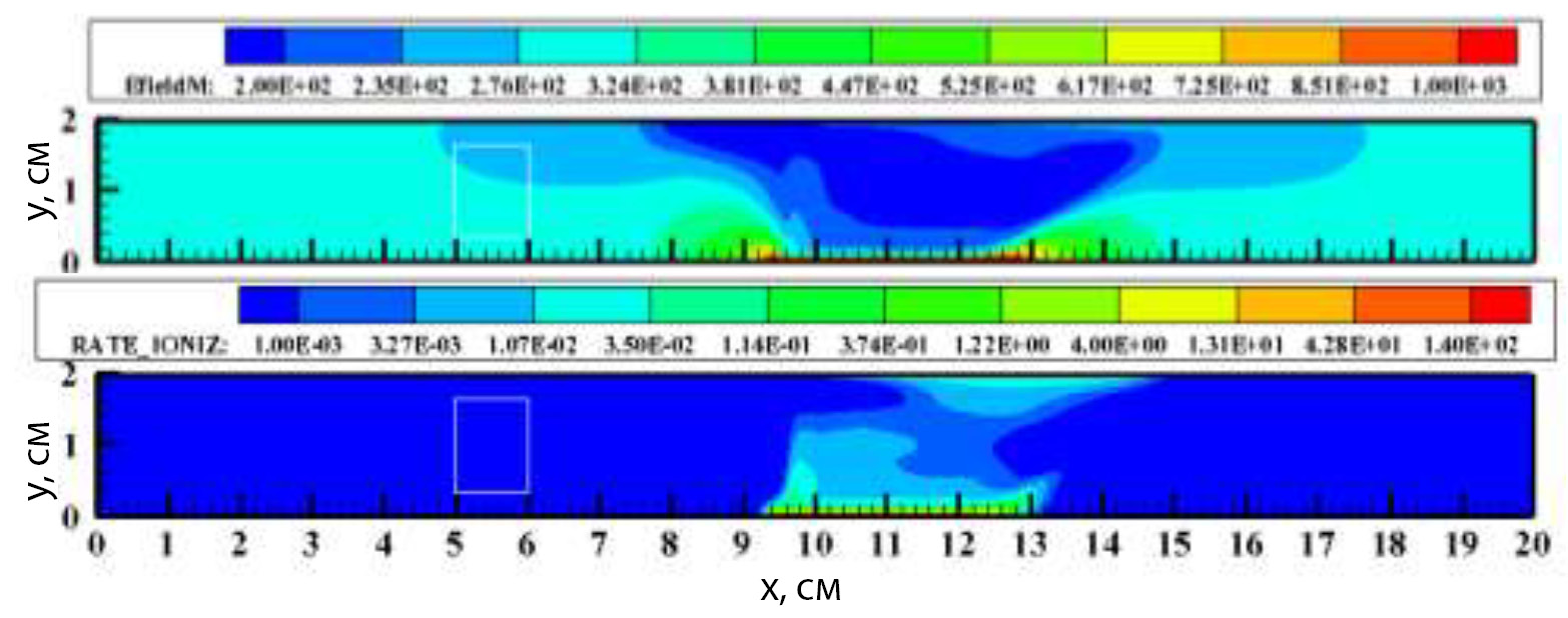 Рис. 12. Распределение напряженности электрического поля и скорости ионизационных процессов в момент времени t = 34.2 мс после начала движения нормального тлеющего разряда в магнитном поле Bz = +0.01 Тл и в потоке М = 2.