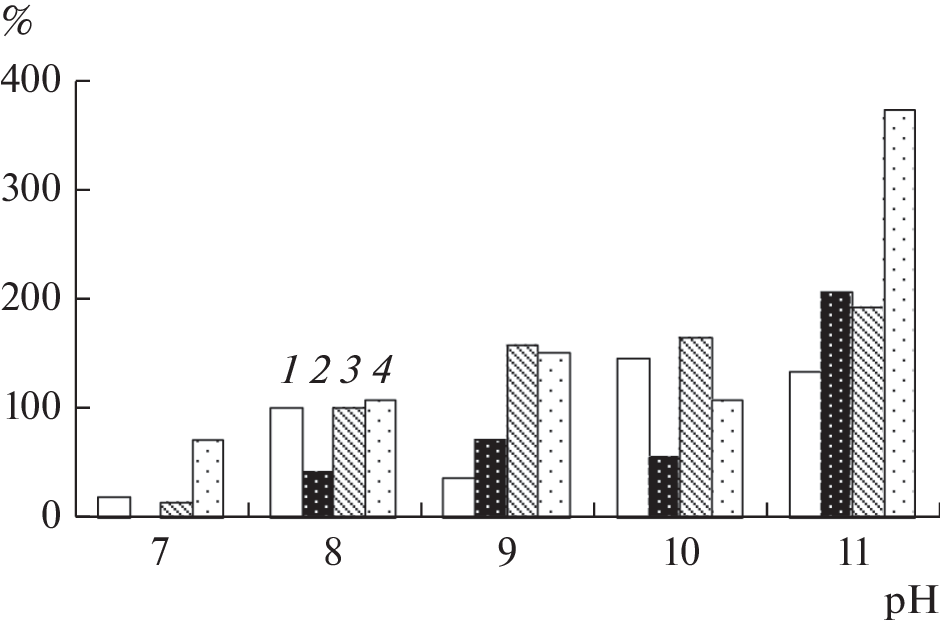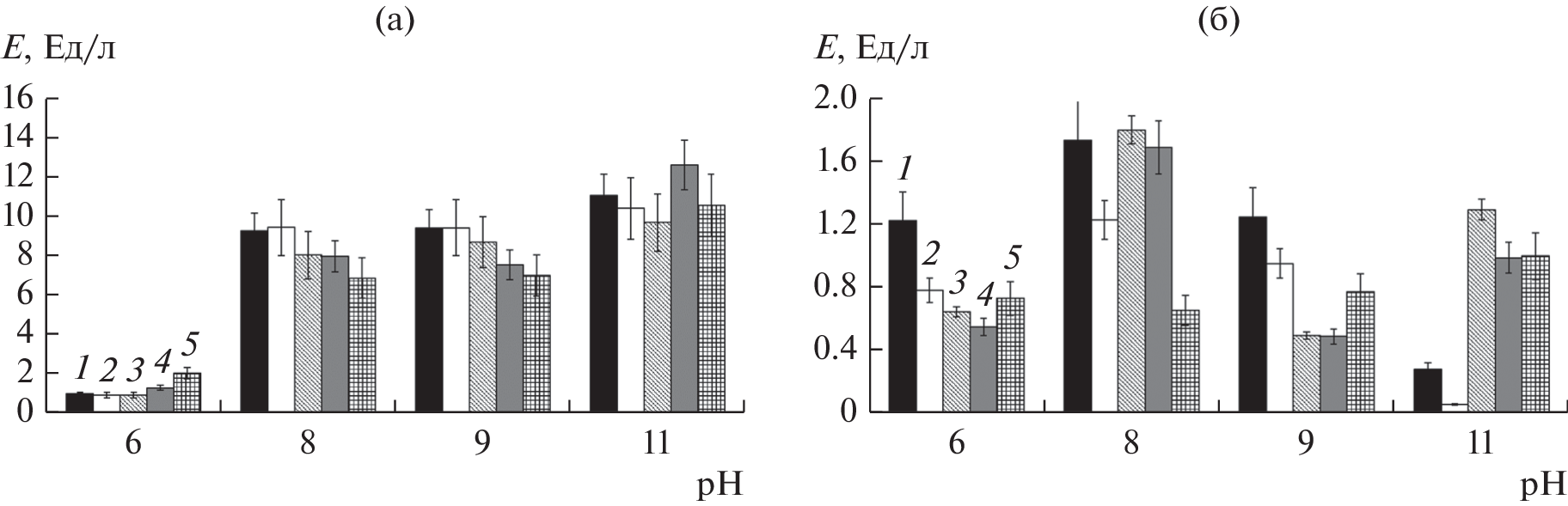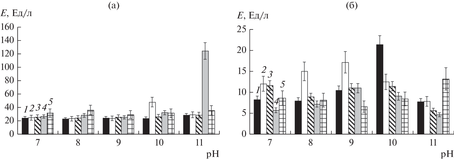Peculiarities of manifestation of hydrolytic activity of haloalkalitolerant bacteria Pseudomonas peli 3-T, Microbacterium kitamiense 16-DB, and Bacillus aequororis 5-DB, isolated from the soil of the territory of the soda sludge storage and the soda sludge of the functioning sludge reservoir of Berezniki Soda Plant (Perm Territory, Russia) were studied. It was shown that the maximum activity of extracellular lipases and amylases of the three studied bacteria were manifested at pH 11 and a high concentration of sodium chloride (50–200 g/L). Cultivation of P. peli 3-T on a mineral medium with 0.5% glycerol (source of carbon) and 0.03% urea (source of nitrogen) makes it possible to obtain biomass (6.9 g/L) and activity of extracellular lipase (1.26 U/L) and lipase associated with cells (3.02 U/mg dry cells) with a high economic ratio of substrate consumption (138%). The efficiency of immobilization of P. peli 3-T and B. aequororis 5-DB cells for use in lipid and starch biotransformation was shown. P. peli 3-T cells immobilized by adsorption on kaolin and incorporated into the structure of barium alginate and agarose gels retained from 40.4 to 63.8% of the cell lipase activity in suspension. B. aequororis 5-DB cells immobilized by adsorption on kaolin retained 42.5% of lipase and 90.7% of amylase activity as compared to the initial ones. At the same time, the activities of the P. peli 3-T and B. aequororis 5-DB enzymes were preserved during 6 consecutive reactions. The amylase activity of immobilized M. kitamiense 16-DB cells by adsorption on kaolin and chitosan decreased to 2.7–3.5% of the initial value and was completely inhibited upon immobilization by cell’s entrapment into barium alginate gels or agarose gels.