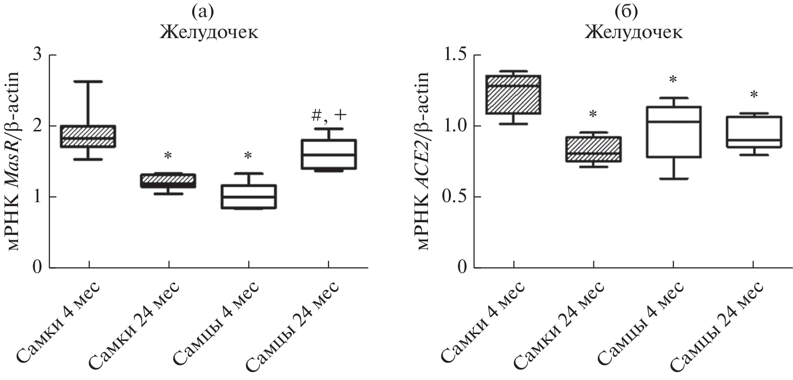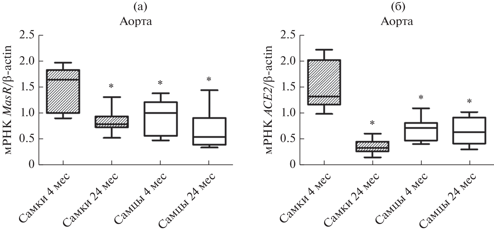 The sex differences of age-related changes in the functional activity and expression of receptor and regulatory proteins of the renin-angiotensin system (RAS) in the aorta and myocardium of rats is evaluated. It was found that with age in females, the sensitivity of the aorta to the vasoconstriction action of angiotensin II increases, while in older males it remains unchanged. In the aorta of old females, a decrease in the mRNA levels of ACE, MasR and ACE2 was revealed by 1.6, 1.8 and 4.4 times, respectively. It has been shown that during aging in the left ventricle of females, the level of MasR and ACE2 mRNA decreases, in males, on the contrary, the level of ACE and MasR mRNA increases. The results obtained indicate the sexual characteristics of age-related changes in RAS activity in the vessels and heart of rats.