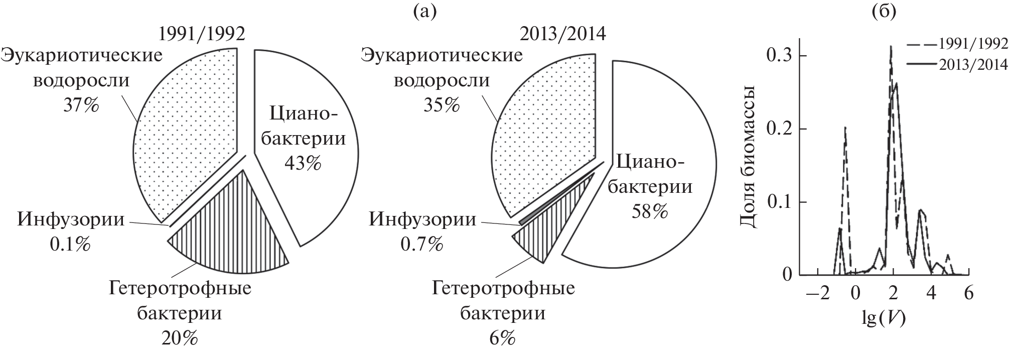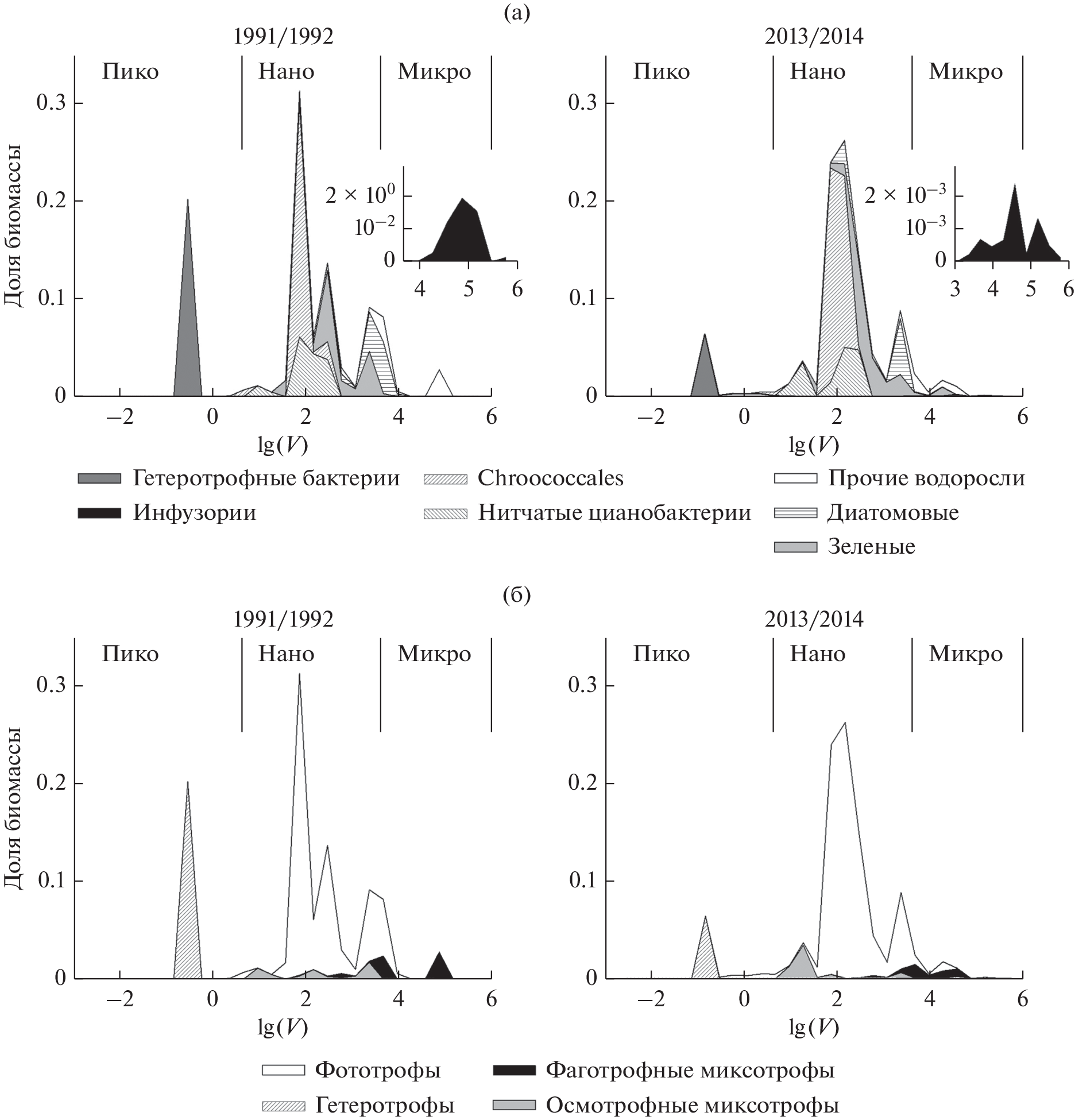 The results of an analysis of the size spectra of unicellular plankton (bacteria, algae, ciliates) in the hypertrophic freshwater urban lake (L. Bolshoe Vasilyevskoe, Togliatti, Russia) are presented. Two types of size spectra have been identified in the seasonal cycle. Strong nanoplanctonic maximum formed mainly by phototrophic cyanobacteria and Chlorophyta was found during the period of open water (spring to autumn); picoplankton maximum/maxima (mainly heterotrophic bacteria) and increased proportion of microplankton (heterotrophic and mixotrophic ciliates)–in the ice period. The peculiarity of the studied lake, in contrast to less productive ones is the stability of the plankton size structure over the past 25 years.