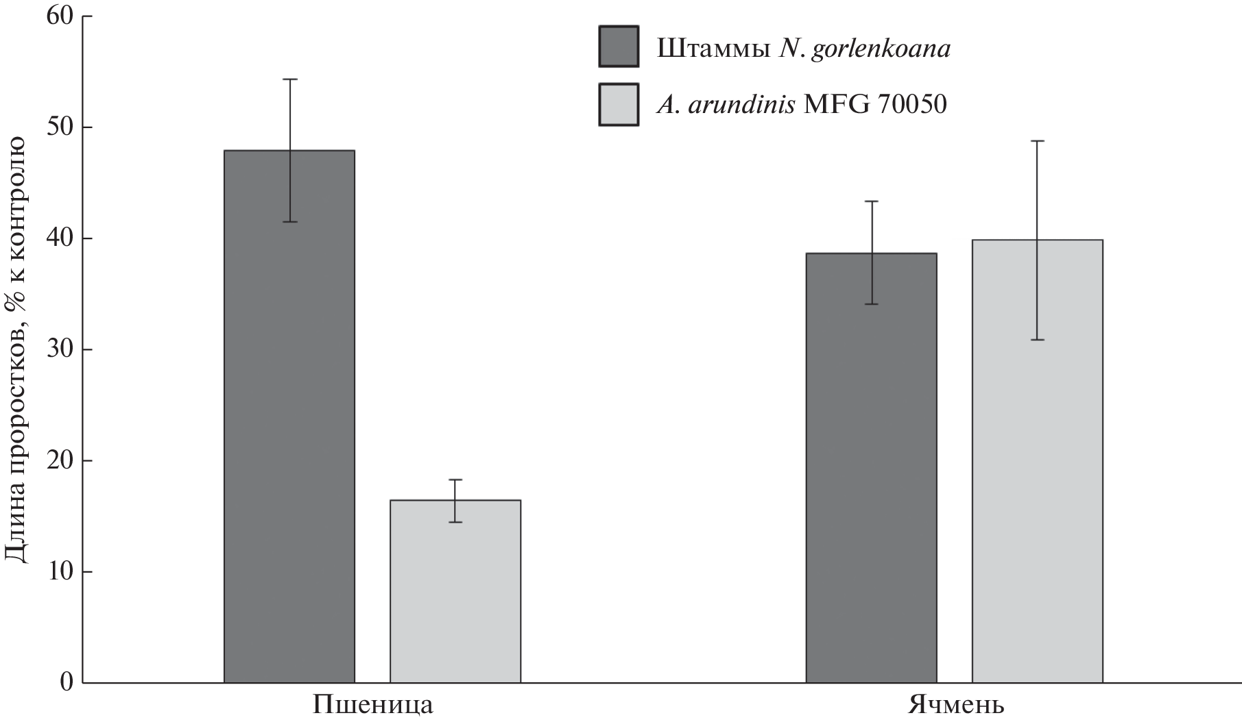 The ubiquitous distribution of Nigrospora fungi in the mycobiota of cereal grain in Russia has been established. Fourteen Nigrospora strains using phylogenetic analysis of ITS, tub, and TEF loci were identified as N. gorlenkoana, first identified in Russia. Morphological characteristics of N. gorlenkoana strains were analyzed on various nutrient media. A wide temperature range of 15–25°C was optimal for growth of N. gorlenkoana strains. This probably contributes to the wide distribution of N. gorlenkoana in nature. The pathogenicity of N. gorlenkoana strains to cereal crops was shown. The fungal strains reduced length of wheat and barley seedlings on average 48% and 39% compared to the control, respectively.