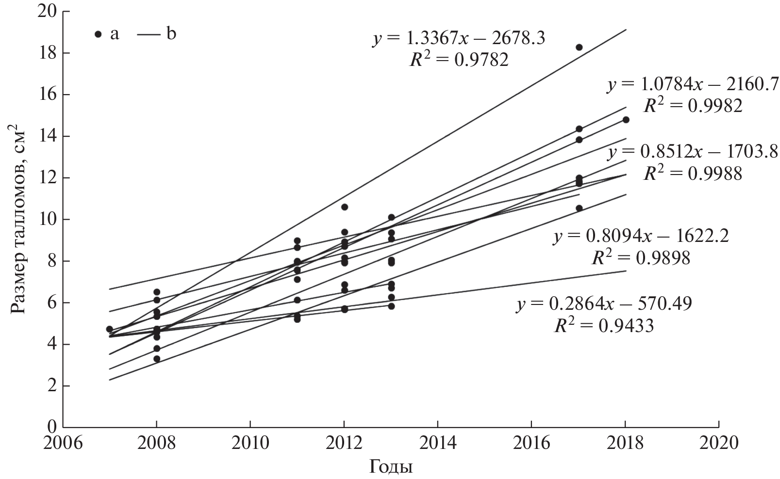 On the territory of the Kivach State Nature Reserve (North-West Russia, the Republic of Karelia) in the supralittoral conditions of the Suna River coast, the growth characteristics of 3 epilithic lichen species – Bellemerea alpina, Lecidea lapicida, Protoparmeliopsis muralis – were studied. Data were analyzed over an 11‑year follow-up period. For each studied thallus, a growth model was created using regression analysis, which reflects the dependence of the area of the thallus on the year of measurement and makes it possible to estimate the age of the thalli. Data were obtained on the size (cm2), growth rate (cm2/year), and age (years) of thalli. For these signs, the confidence interval of the means and the confidence interval of possible values were estimated at a probability of P = 95%.