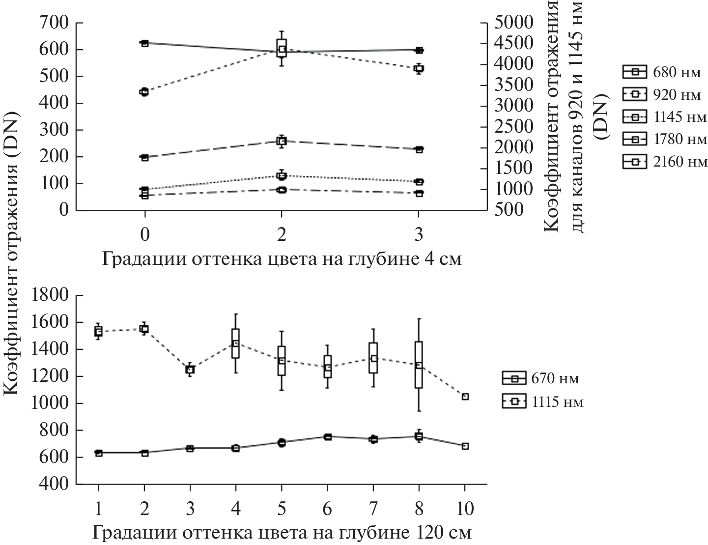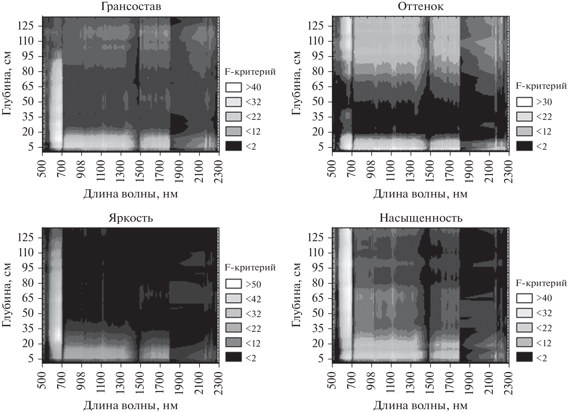 It is studied the representation of the texture and color of the soil on the Mansell scale, measured to a depth of 135 cm with an interval of 5 cm on the transect (length 6 km) with a step of 20 m, in hyperspectral data of the Hyperion instrument for 9 measurement periods from January to September. It was found that satellite image for May 24 is most closely related to all the characteristics under consideration. For the soil texture – the largest relationships are observed for depths of 7–15 cm, 45 cm, 75 cm and 120 cm; for color hue – 3–10 cm and 95–135 cm; for color value – 7–15 cm, 25–30 cm and 65–70 cm; for color chroma – 7–10 cm, 40–50 cm, 75 cm and 100 cm. The texture of soil is most related with wavelengths 579–702 nm and 529 nm, color hue – 641–691 nm, color value – 569–702 nm and 518–539 nm, color chroma – 569–702 nm, 508–529 nm and 732–763 nm.