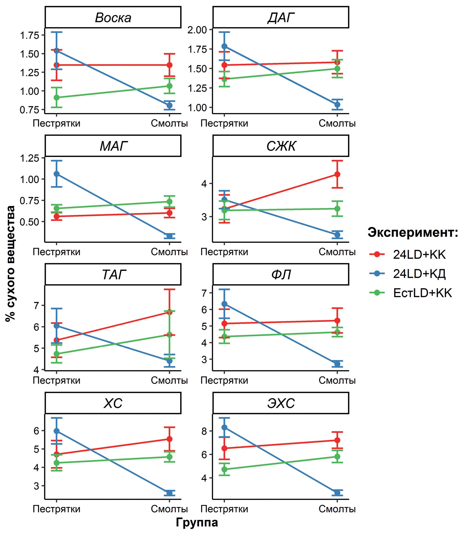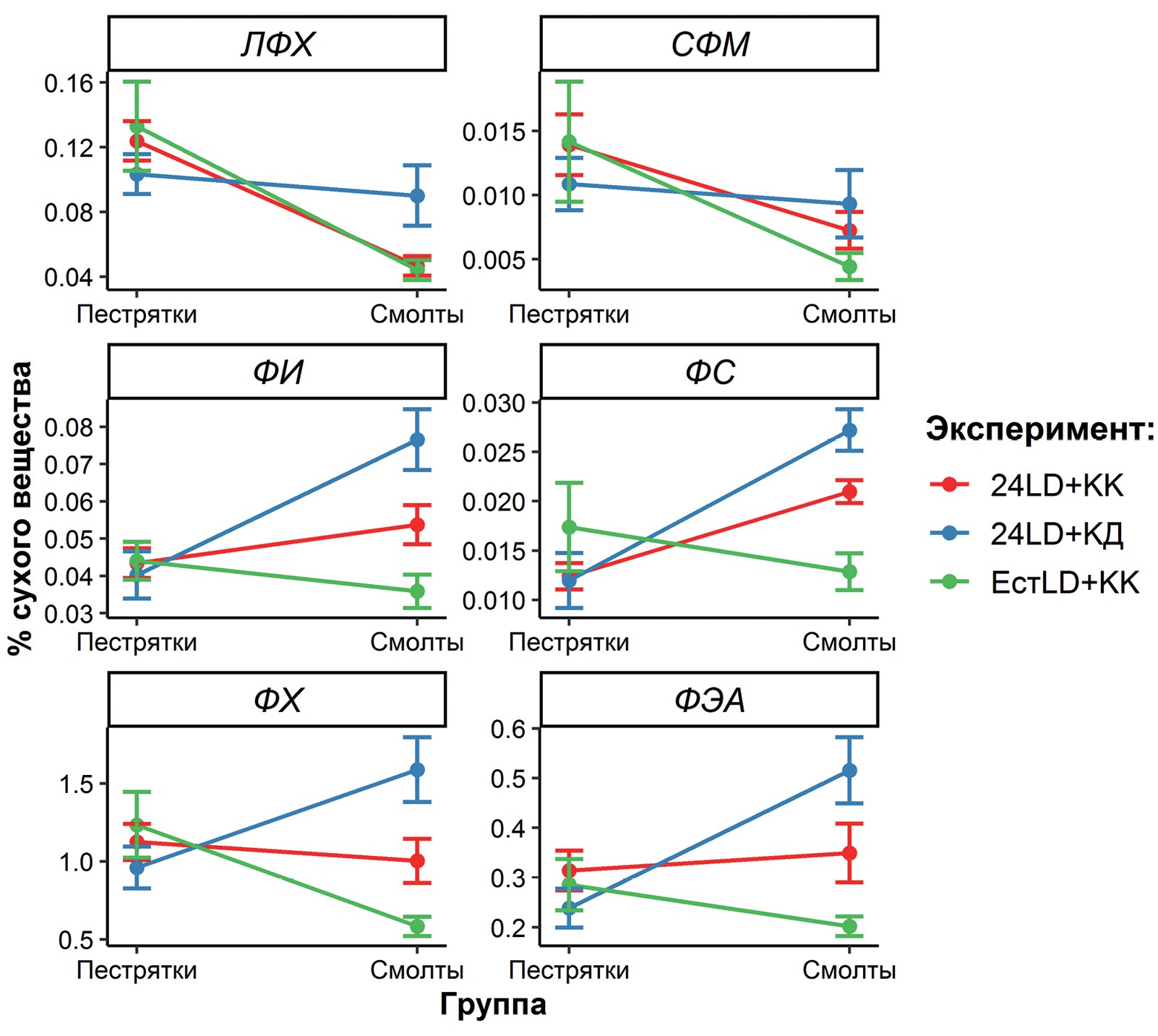В мышцах пестряток не обнаружено достоверных отличий по содержанию исследованных липидных классов между группой 24LD + КК и ЕстLD + КД, при этом рыбы группы 24LD + КД отличались достоверно меньшим содержанием ДАГ, СЖК и восков по сравнению с таковыми из группы 24LD + 24КК. При этом в мышцах смолтов наблюдается достоверно меньшее содержание ФЛ, ДАГ, ХС, СЖК и ТАГ в группе ЕстLD + КД по сравнению с группой 24LD + KK, при этом образцы из группы 24LD + КД достоверно отличаются от 24LD + КК только в содержании ФЛ.