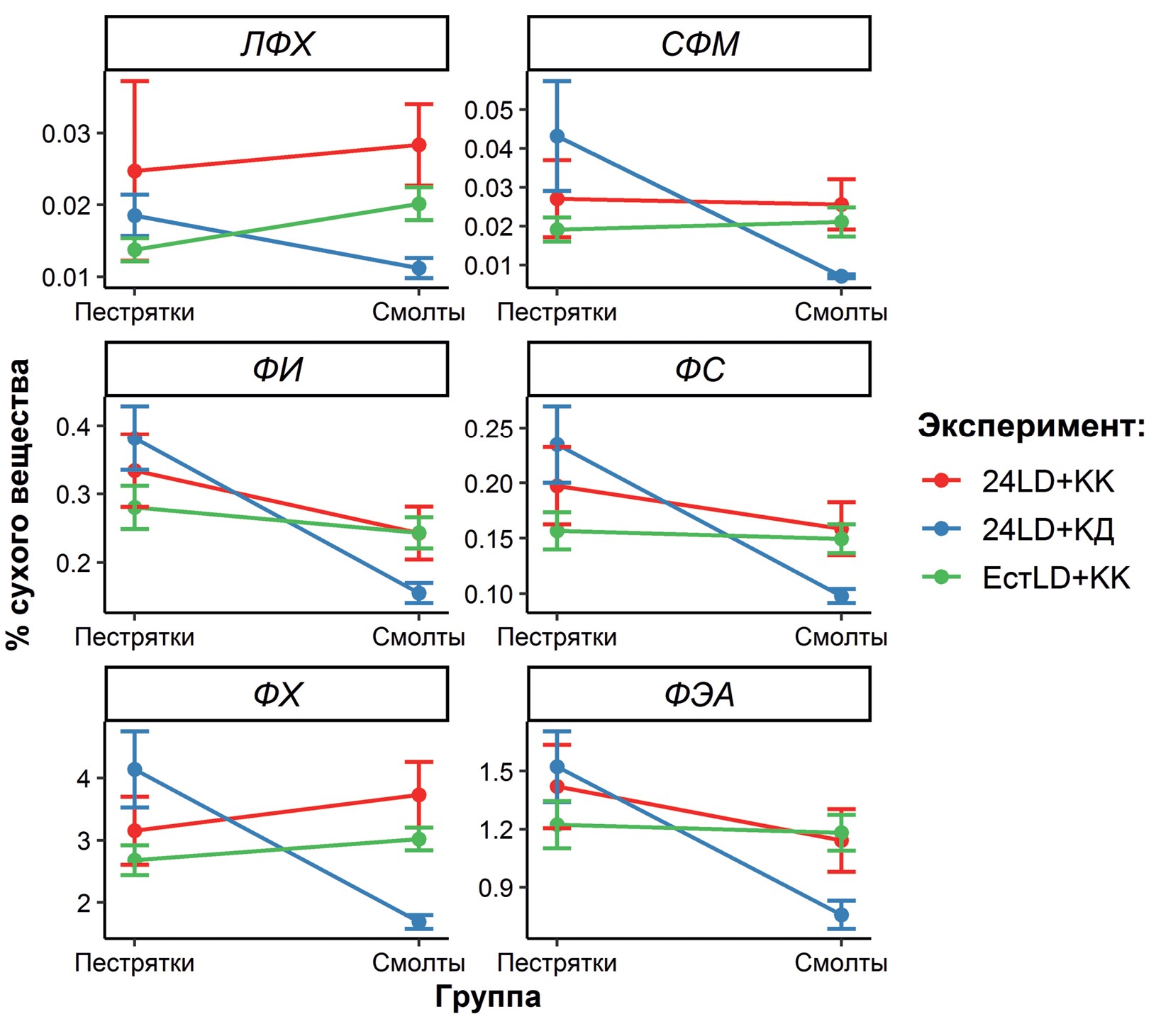 Среди фосфолипидов печени пестряток и смолтов, как и в мышцах, показано доминирование ФХ (1.69–4.14%) и ФЭА (0.76–1.52%). Не выявлено выраженной динамики основных фосфолипидных классов у рыб 24LD + KK и ЕстLD + KД. При этом в группе 24LD + KД у смолтов показано их снижение (достоверное для всех компонентов, кроме ЛФХ) (рис. 6).