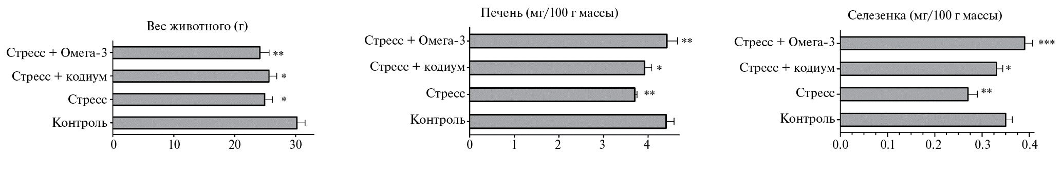 В эксперименте мышей распределили в следующие группы: 1 группа – контроль; 2 группа – стресс (вертикальная фиксация); 3 группа – стресс + ЛЭК; 4-я группа стресс + Омега-3. У всех животных определяли вес в начале и конце исследования. Также по окончании эксперимента произвели взвешивание внутренних органов у всех испытуемых мышей для рассчета индекса массы (ИМ - мг массы органа на 100 г массы тела) печени, селезенки и тимуса. Забор крови производили с использованием техники кровотечения из орбитальных венозных сплетений головы и шеи. Животных выводили из эксперимента декапитацией под легким эфирным наркозом с соблюдением принципов и международных рекомендаций, изложенных в Европейской конвенции по защите позвоночных животных, используемых для экспериментов или в иных научных целях (European Convention, 1986).