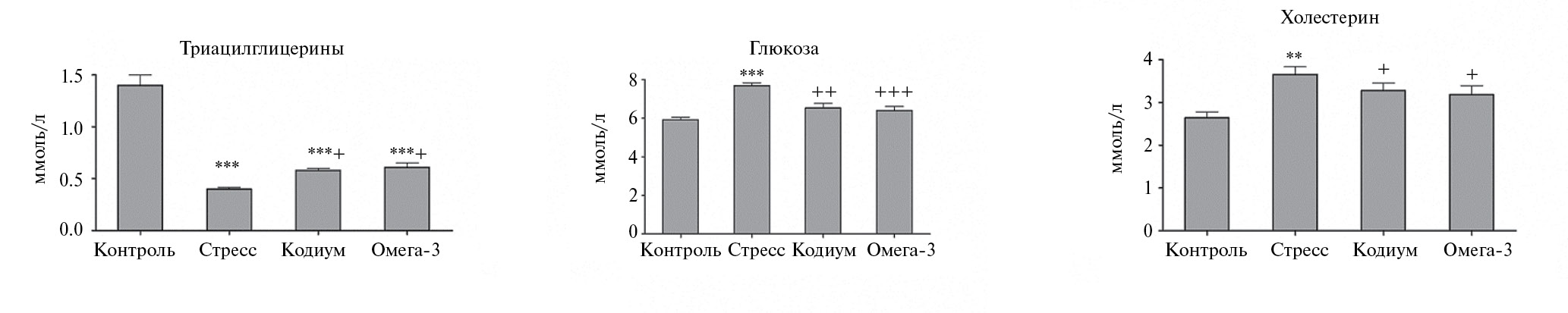 Рис. 2. Влияние липидного экстракта кодиума и Омега-3 на биохимические показатели плазмы крови мышей при стрессе.