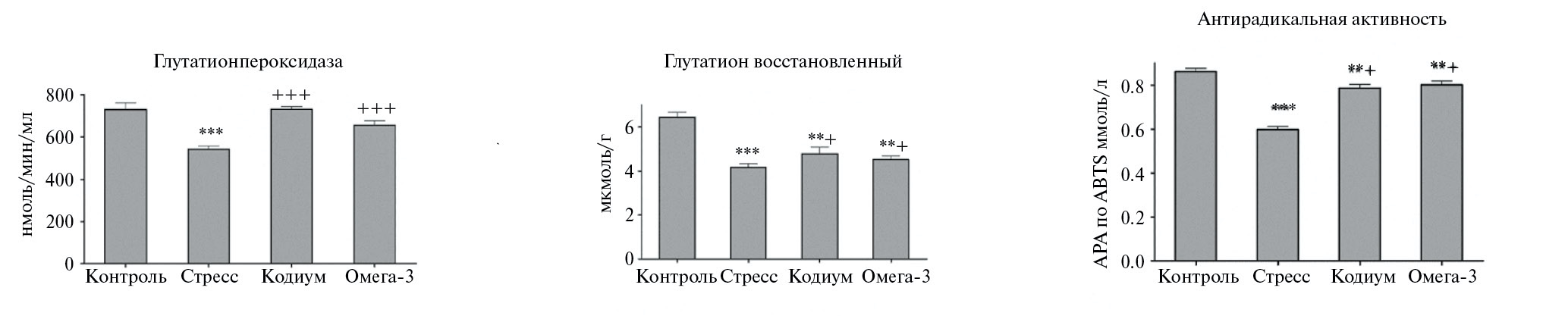 Рис. 1. Влияние липидного экстракта кодиума и Омега-3 на весовые показатели мышей при стрессе. Изменения статистически достоверны: * – p < 0.05, ** – p < 0.01, *** – p < 0.001 – при сравнении с контролем; + – p < 0.05,++ – p < 0.01,+++- p < 0.001 – при сравнении со 2-й группой (стресс) для рис. 1–3.
