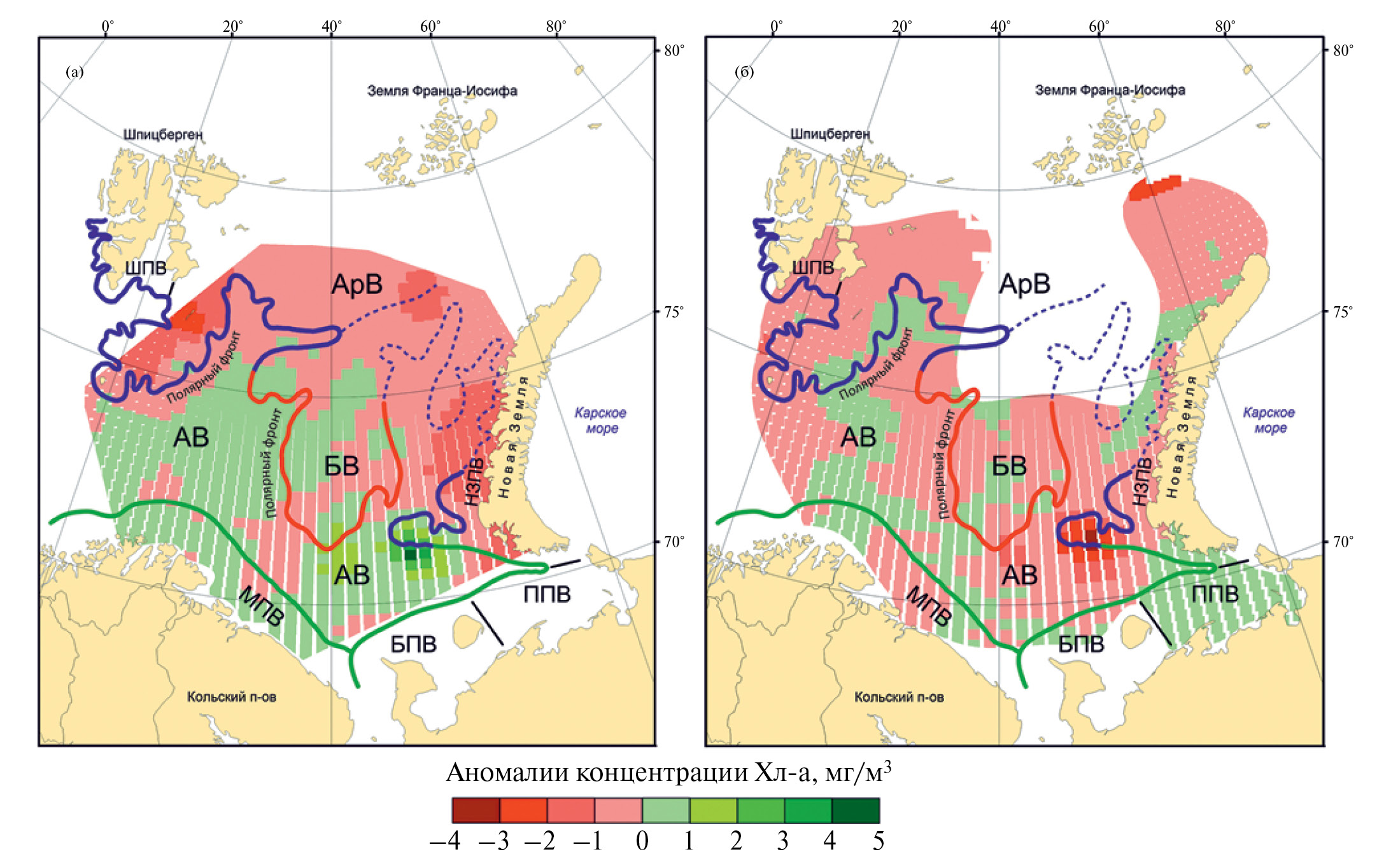Рис. 3. Аномалии концентрации хлорофилла а в поверхностном слое Баренцева моря: (а) лето; (б) осень. Водные массы: АрВ – арктическая, АВ – атлантическая, БВ – баренцевоморская, МПВ – мурманская прибрежная, НЗВП – новоземельская прибрежная, ППВ – печорская прибрежная, ШПВ – шпицбергенская прибрежная, БПВ – беломорская прибрежная.