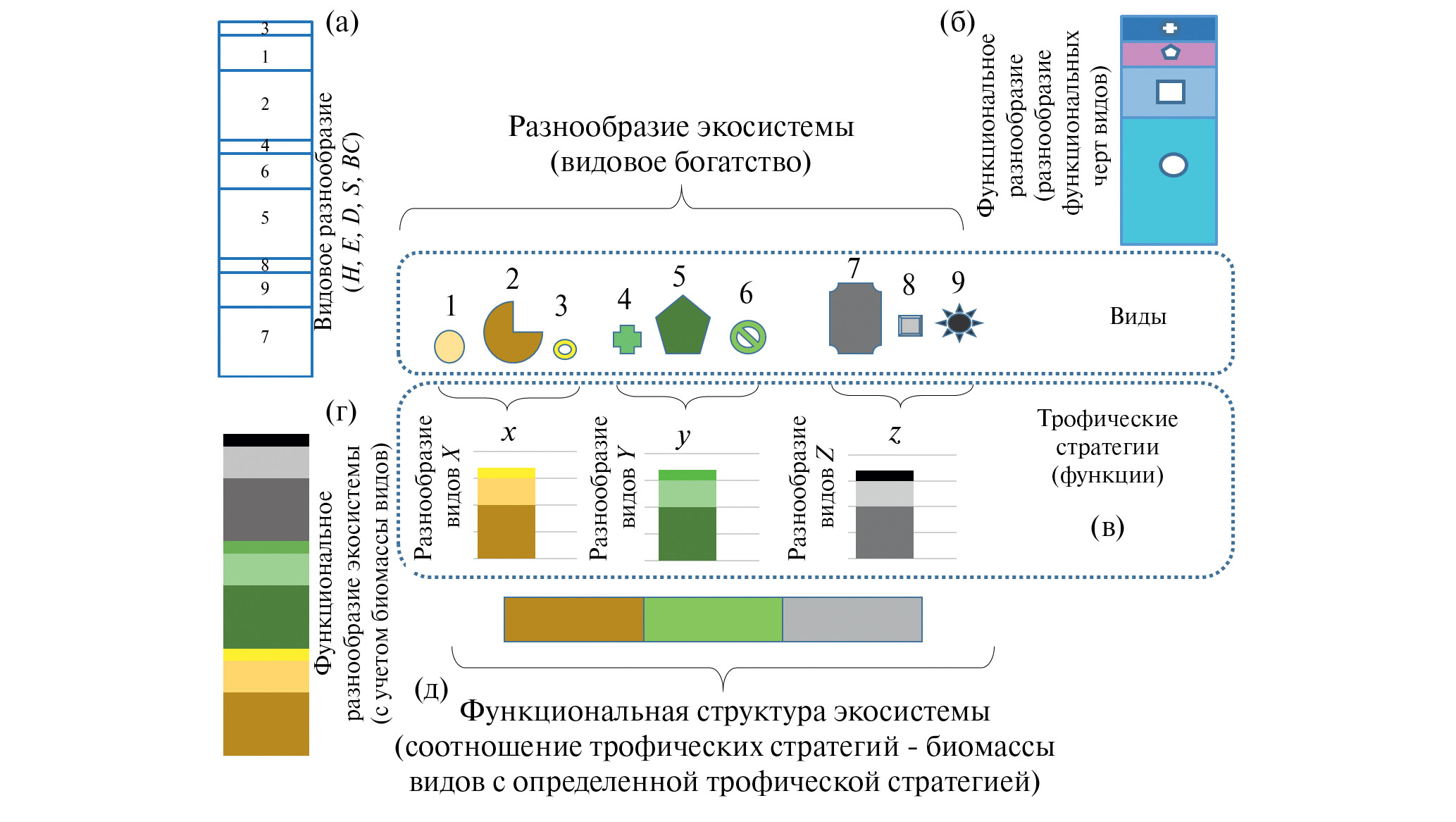 Здесь нам хотелось бы подчеркнуть, что во всех случаях, успешное управление экосистемами возможно на основе постоянного получения адекватной информации, характеризующей биоразнообразие системы. Традиционно общей характеристикой является разнообразие, оцениваемое с учетом видового богатства – числа видов, и/или их пропорциональной представленности (Hilmers et al., 2018), оцениваемой различными индексами разнообразия (рис. 3а). Однако, эта информация дает лишь самое общее представление об экосистеме и не всегда связана с ее функциональной структурой и продуктивностью (Wu et al., 2023). Понимание взаимосвязей и взаимодействий в экосистеме может быть значительно расширено при использовании “функциональных признаков” (Mlambo, 2014). В последнее время лавинообразно нарастает число публикаций, посвященных изучению функционального разнообразия экосистемы (Petchey, Gaston, 2006; Gross et al., 2017; Weiss, Ray, 2019; Wu et al., 2023), с целью оценки экосистемных услуг (Díaz et al., 2006, de Bello et al., 2010), функций (Reiss et al., 2009), охраны и менеджмента (Vandewalle et al., 2010).
