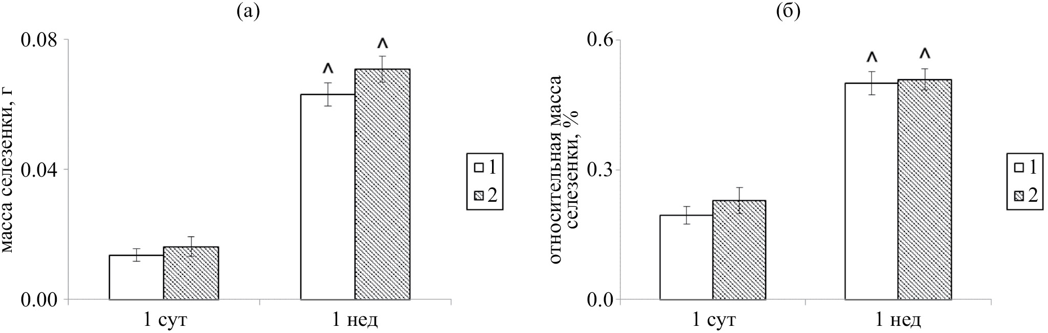 Рис. 1. Изменения абсолютной (а) и относительной (б) масс селезенки в первую неделю жизни у крыс контрольной группы (1) и развивавшихся под воздействием низких доз ДДТ (2) (M ± m). ^ — статистически значимые отличия от соответствующих значений в 1-е сутки постнатального развития, * — от значений контрольной группы (р < 0.01)