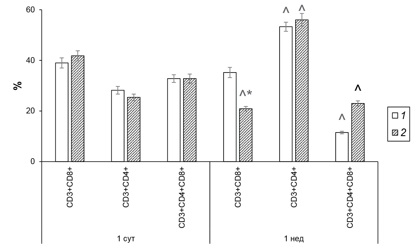 В возрасте 7 суток у крыс контрольной группы выявлено двукратное снижение доли В-клеток в суспензии клеток селезенки (рис. 5а). Содержание Т-клеток увеличилось более чем в три раза (рис. 5б). Произошли существенные изменения в популяции Т-клеток. Доля Т-цитотоксических лимфоцитов уменьшилась, а Т-хелперов увеличилась. Значительно снизилось содержание дифференцирующихся двойных позитивных Т-клеток (рис. 6).