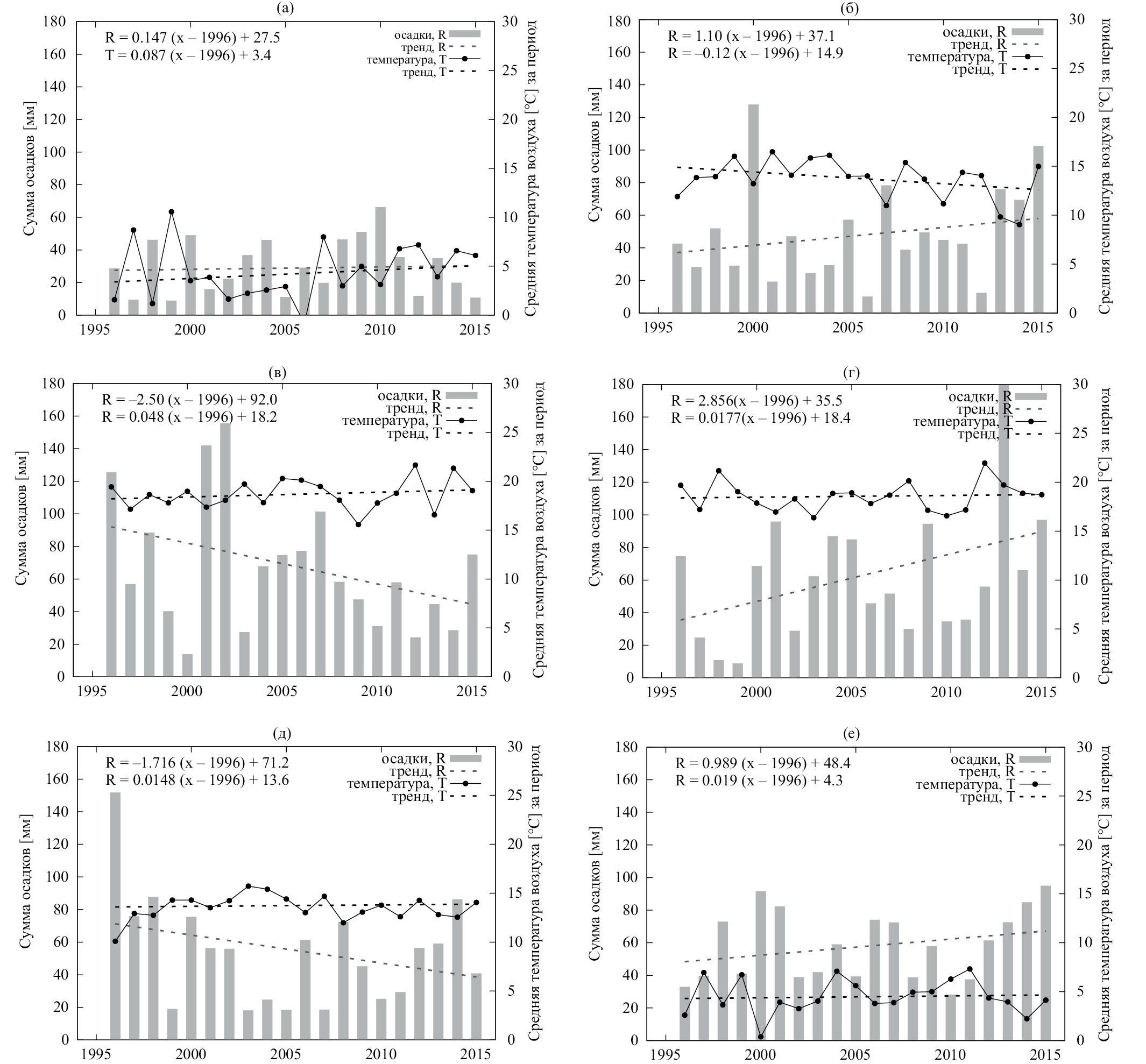 Рис. 1. Тренды метеорологических показателей субсезонов теплого периода года в Новосибирске: а — ранняя весна (1 апреля — 5 мая); б — зеленая весна (6 мая-10 июня); в — перволетье (11 июня — 15 июля); г — полное лето (16 июля — 15 августа); д — первоосенье (16 августа — 20 сентября); е — золотая осень (21 сентября — 31 октября)