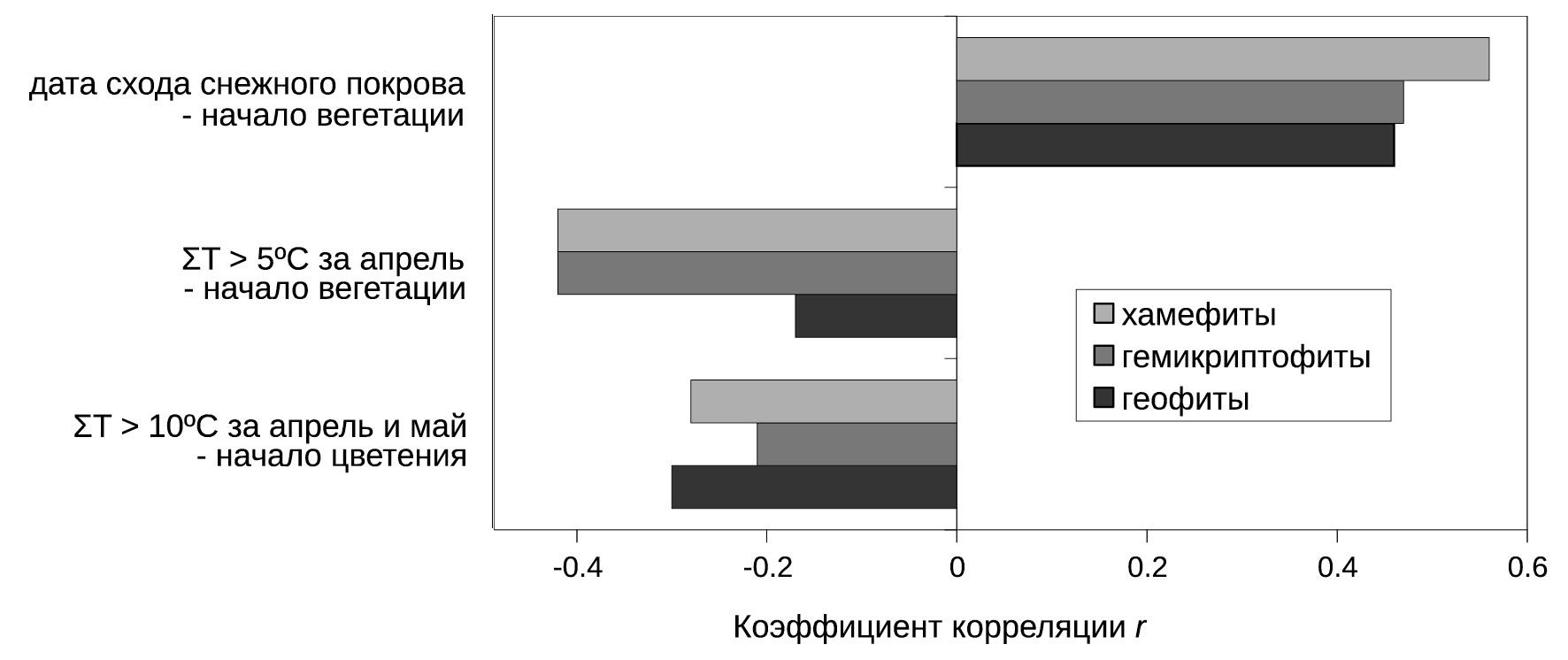 Корреляции фенофаз с метеоусловиями. Рис. 2 демонстрирует зависимость средних дат начала вегетации в группах от погодных условий весны — даты схода снежного покрова и сумм температур воздуха выше 5°C, а также средних дат начала цветения от сумм температур воздуха выше 10°C. Корреляции со снеготаянием высокие и положительные, т. е. более длительное сохранение снежного покрова задерживает вегетативную фазу. Напротив, корреляции с температурными условиями отрицательные и наиболее высокие в начале сезона: накопление тепла стимулирует рост, особенно у хамефитов и гемикриптофитов, но при переходе к репродуктивной фазе эта зависимость ослабевает.