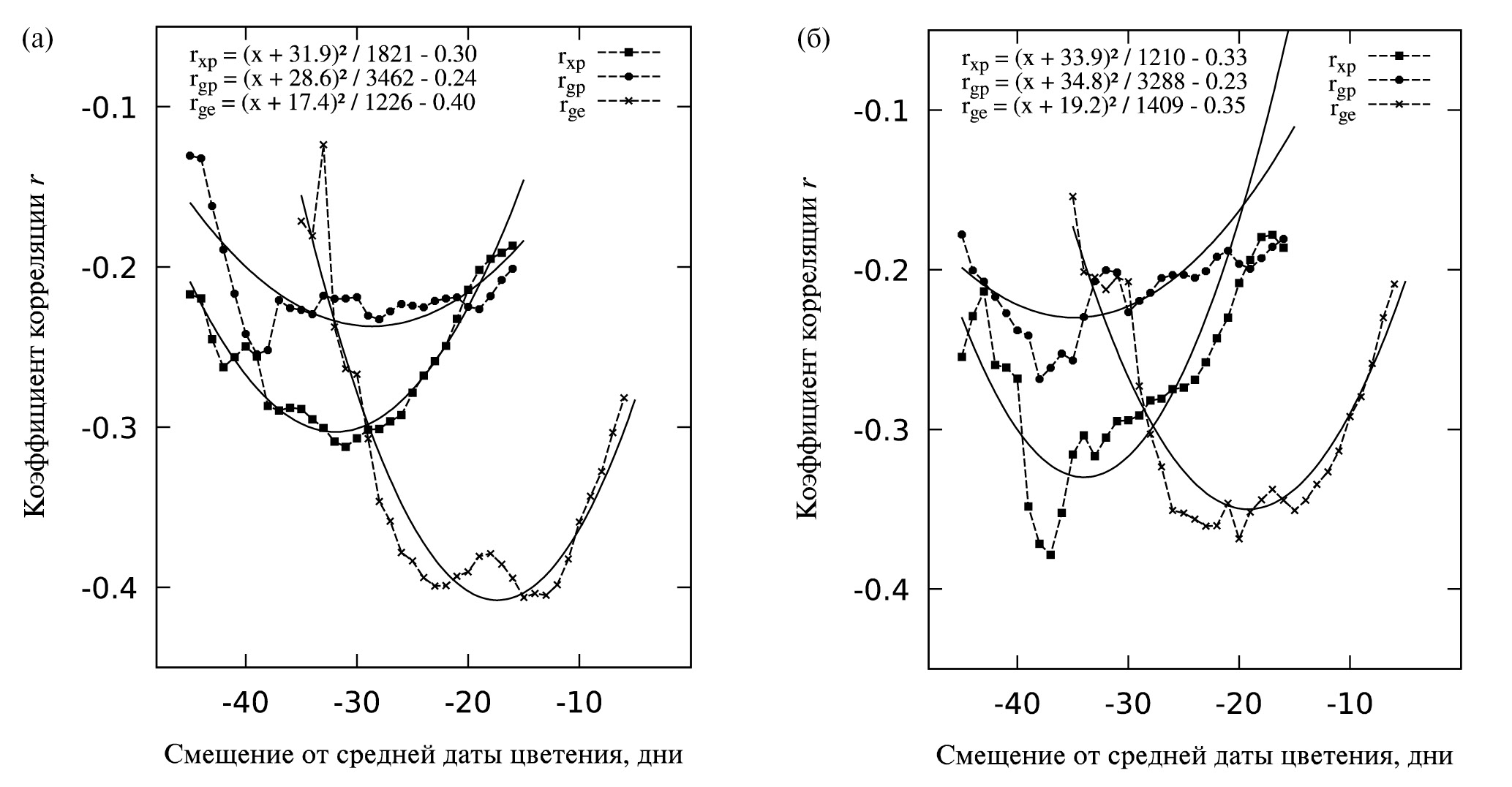Мы также рассчитали корреляции средних дат начала цветения по группам с суммами температур воздуха выше 5°C и выше 10°C на разных промежутках от времени наступления фенофазы, определив таким образом продолжительность предшествующих периодов с максимальным влиянием температур на начало цветения (рис. 3). Для пар значений смещение — коэффициент корреляции построены квадратичные регрессионные кривые по группам видов. Уравнения позволяют вычислить позицию и значение минимума каждой кривой: R = (x - xmin)2 / c1 + ymin, где коэффициенты xmin и ymin указывают на координаты минимума кривой.