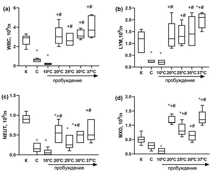 Рис. 1. Динамика изменения WBC (а), LYM (b), NEUT (c) и MXD (d) в крови сусликов при зимней спячке и индуцированном пробуждении (Me [Q1: Q3]), минимальное и максимальное значение выборки; р<0.05 относительно: * — контроля, + — спячки, # — начальных этапов пробуждения Тb10°C). К — контроль, С — торпидное состояние. Стрелкой указана температура тела во время пробуждения
