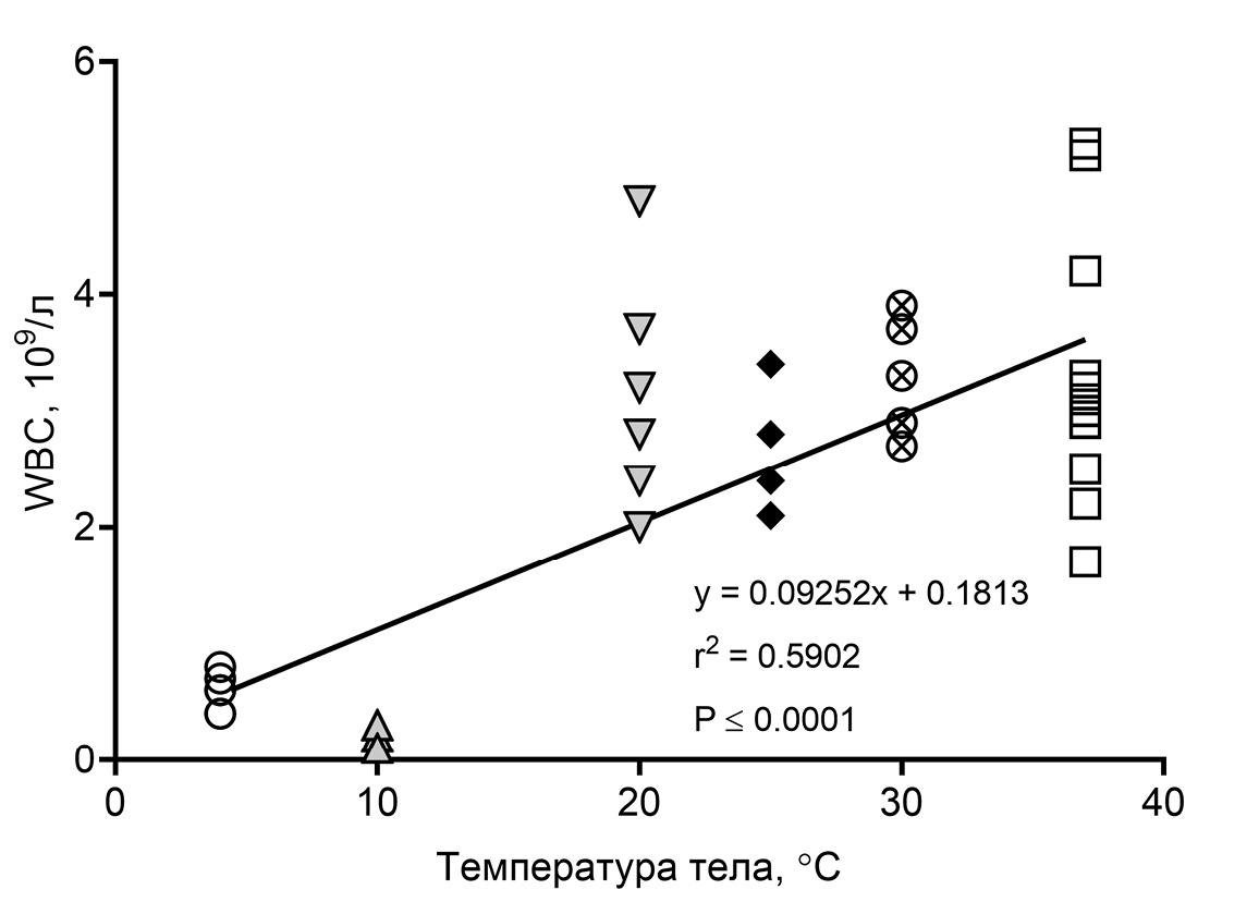 Рис. 2. Регрессионный анализ влияния температуры тела сусликов на WBC крови