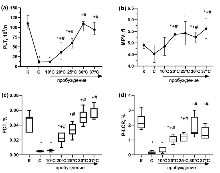 Рис. 3. Динамика изменения PLT (a), MPV (b), PCT (c) и P-LCR (d) в крови сусликов при зимней спячке и индуцированном пробуждении (на диаграммах — Me [Q1: Q3], минимальное и максимальное значения выборки; на графиках — Me [Q1: Q3]; р<0.05 относительно * — контроля, + — спячки, # — начальных этапов пробуждения Тb10°C). К — контроль, С — торпидное состояние. Стрелкой указана температура тела во время пробуждения