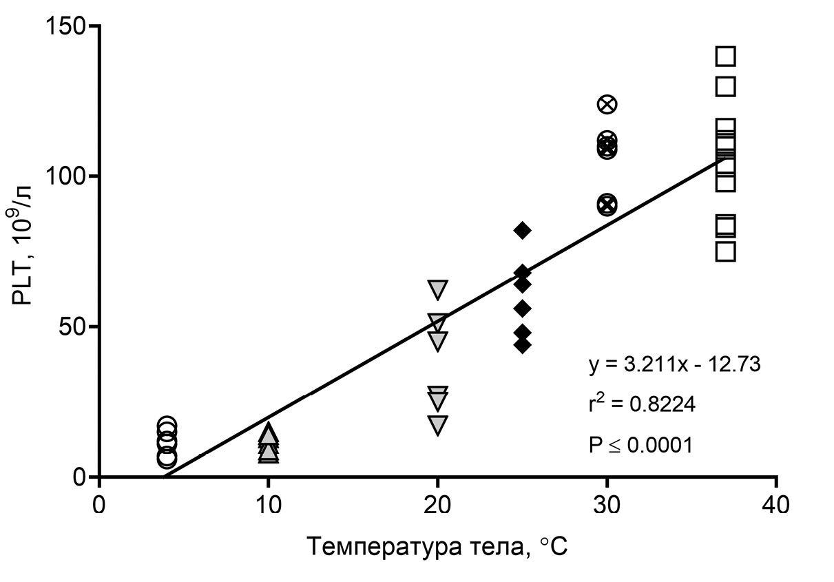 Рис. 4. Регрессионный анализ влияния температуры тела сусликов на PLT крови