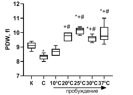 Анализ параметра PDW, демонстрирующего распределение тромбоцитов по объему, показал, что при спячке данный показатель снижается (контроль — 9.1[8.9:9.2]%, спячка — 8.35[8.2:8,4] fl, р<0.05) (рис. 5). На начальных этапах пробуждения (Tb 10°C) имеется тенденция к незначительному повышению PDW. Однако у животных с Tb 20°C данный показатель становится существенно (на 17.1 %, р<0.05) выше PDW спящих животных и достигает при Tb 25°C максимальных значений (10.2[9.9:10.3]). Это указывает на то, что диапазон распределения тромбоцитов по объему на данном этапе согревания становится несколько шире (рис. 5). Дальнейшее согревание животных незначительно снижает PDW до уровней, близких к контрольным значениям. Между PDW и температурой тела сусликов имеется достаточно слабая корреляция (r = 0.58, р<0.05).