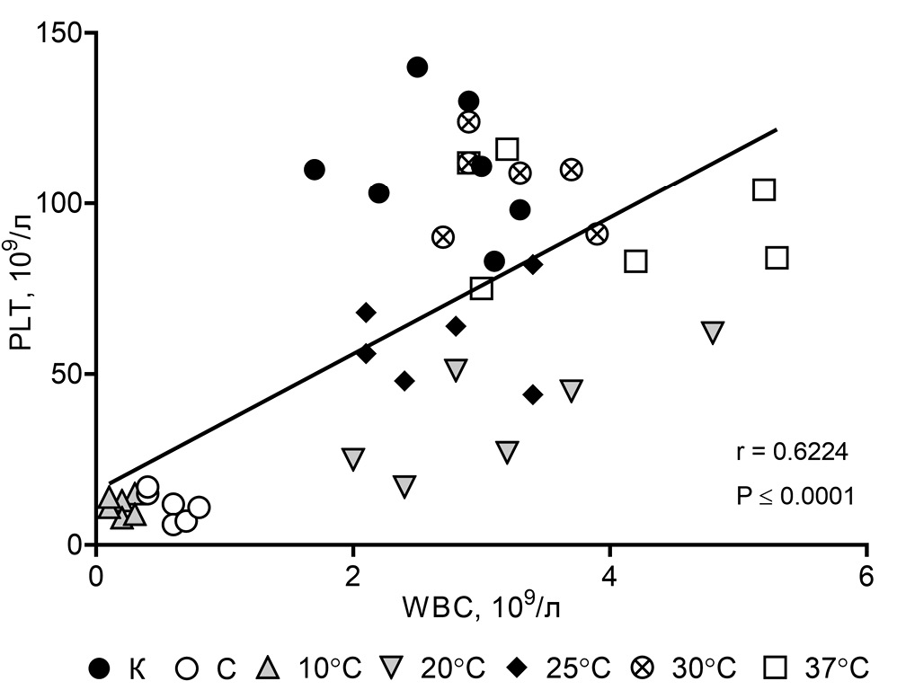 Интересно то, что мы обнаружили наличие достаточно выраженной корреляционной связи между WBC и PLT (рис. 6). Это свидетельствует о том, что на содержание тромбоцитов и лейкоцитов оказывает влияние один и тот же фактор. Учитывая результаты регрессионного анализа, демонстрирующие существенное влияние температуры на данные гематологические параметры (рис. 2 и рис. 4), можно сделать следующий вывод: температура тела животного играет ведущую роль в динамике изменений содержания клеток крови при гибернации.